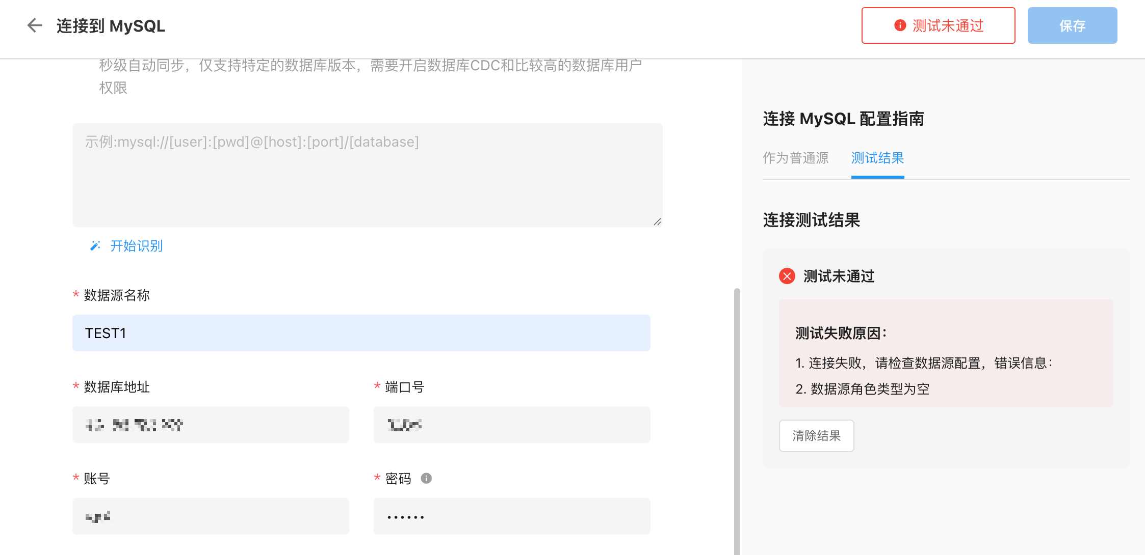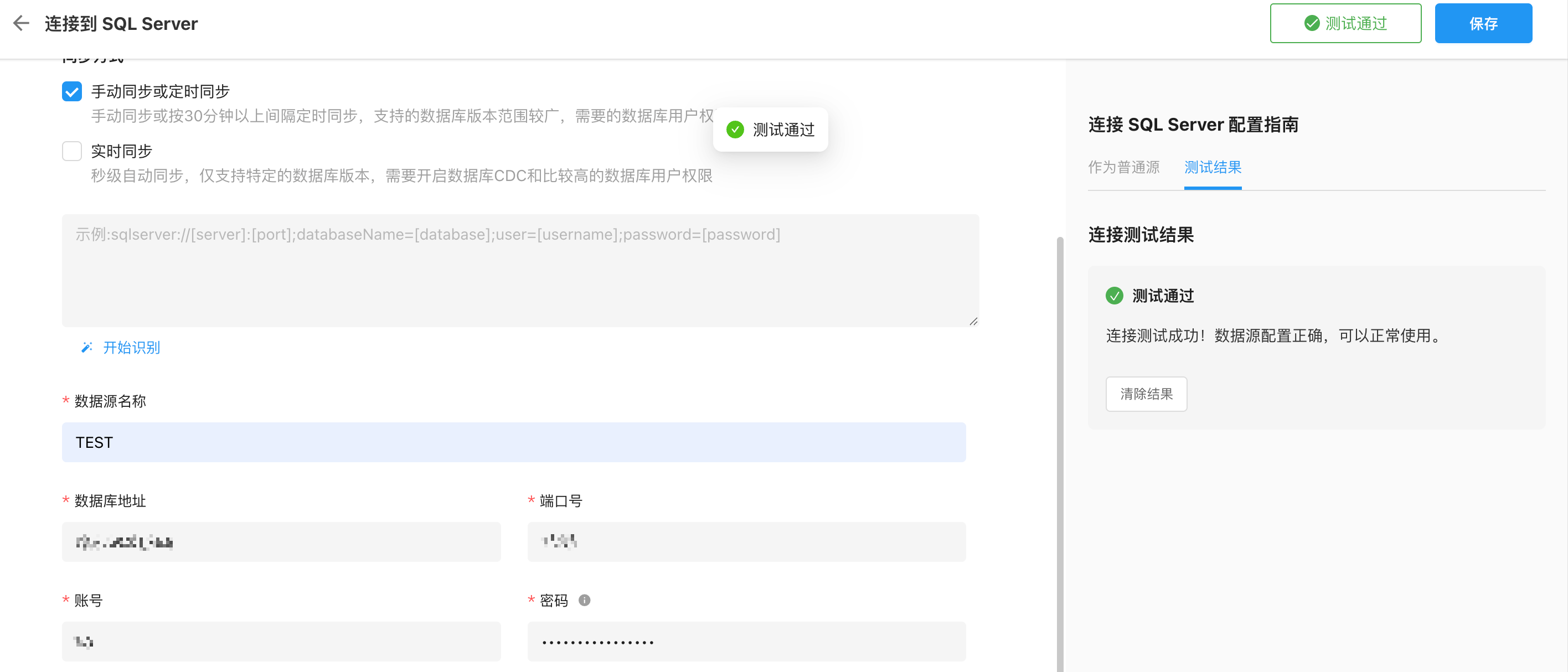 进入数据源配置页后,需要填写数据源名称、数据库地址、端口、账号 密码等信息,不同数据源类型需填写的信息有所不同,需确保填写信息与数据库真实配置一致。