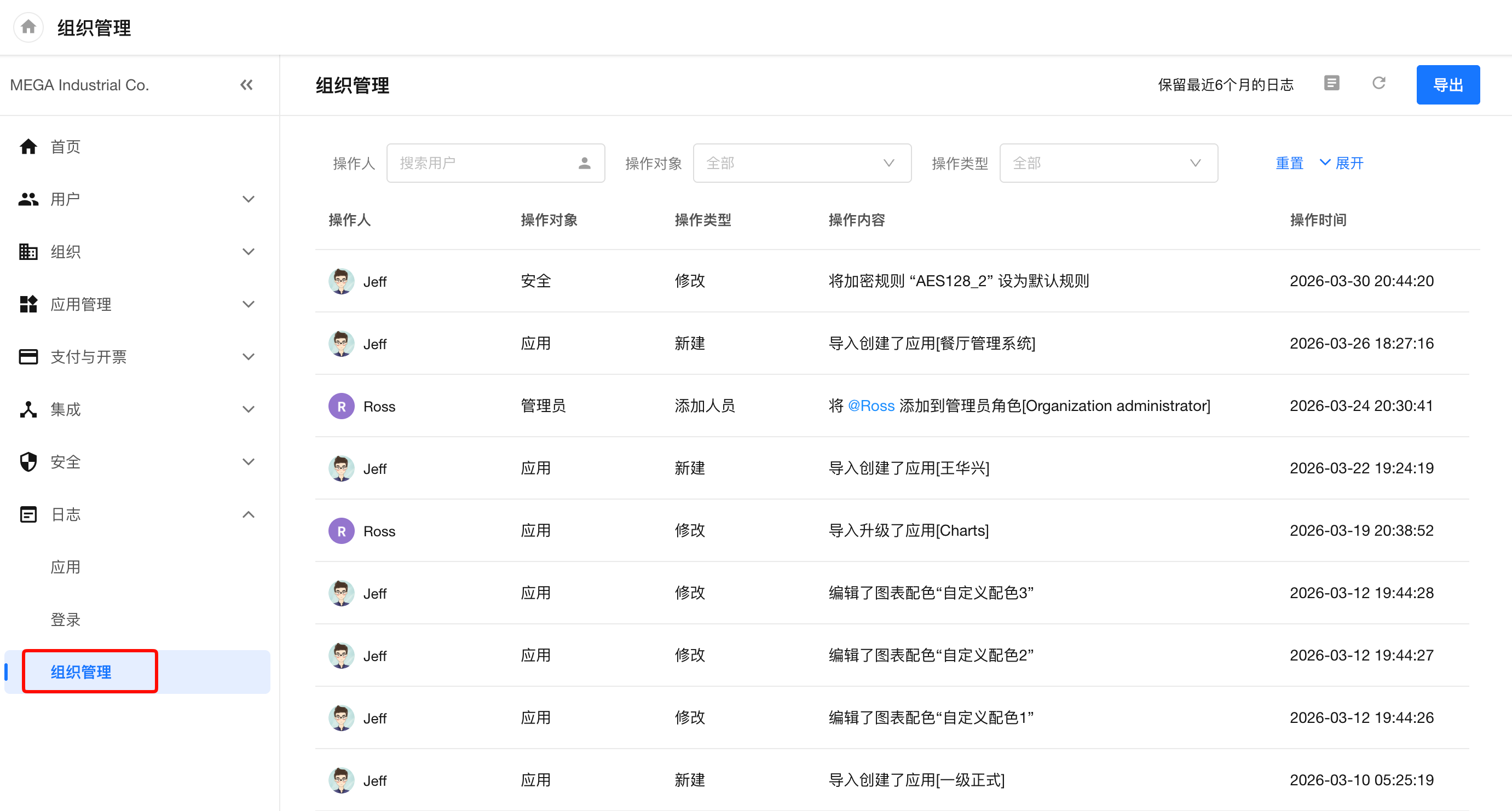 为确保审计安全,拥有日志权限的管理员可以在 “组织管理 > 日志 > 组织管理” 页面中,追踪所有管理员角色的创建、修改及成员变更记录。