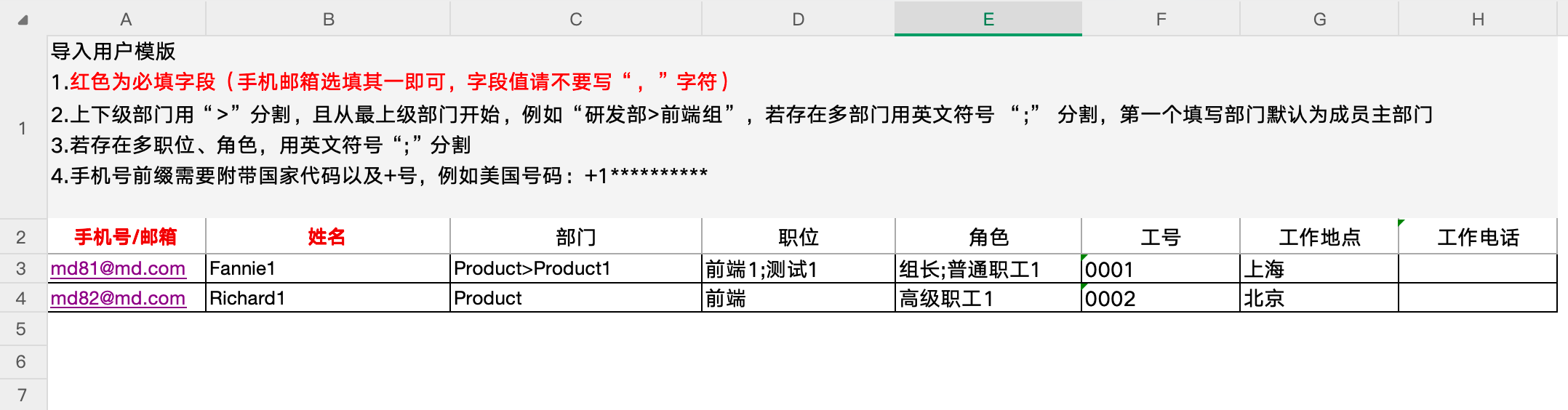 导入的字段有:手机号/邮箱、姓名、部门、职位、角色、工号、工作地点、工作电话。