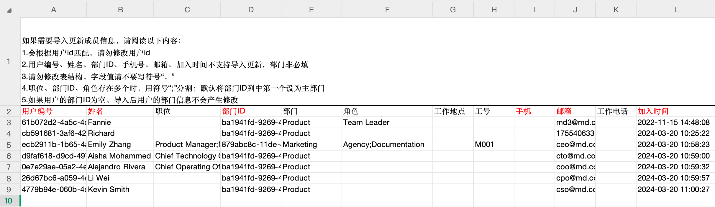 导入的字段有:手机号/邮箱、姓名、部门、职位、角色、工号、工作地点、工作电话。