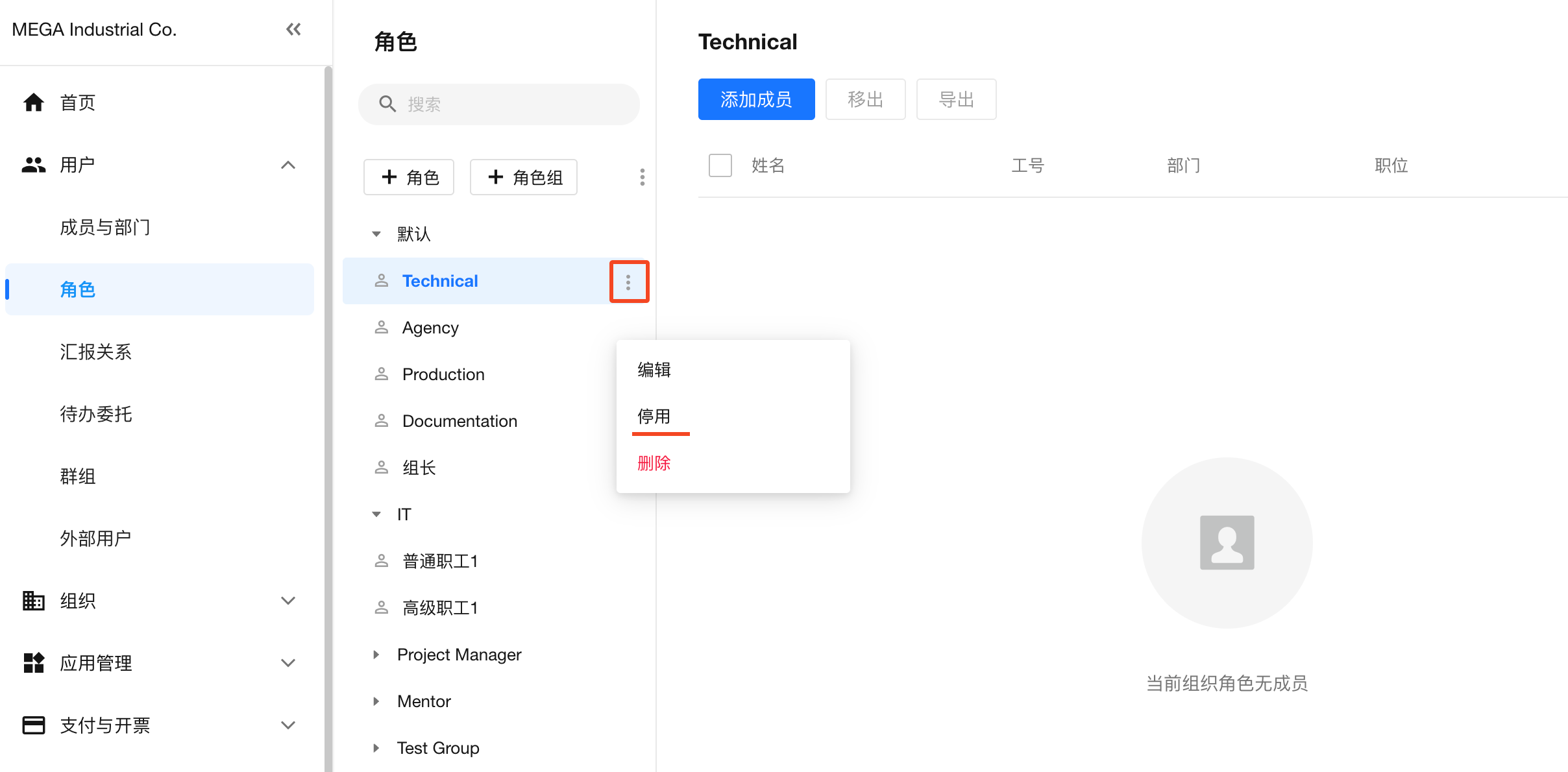 角色和角色组都支持停用,在角色列表中,点击角色名称右侧的操作按钮,可将该角色设置为停用。