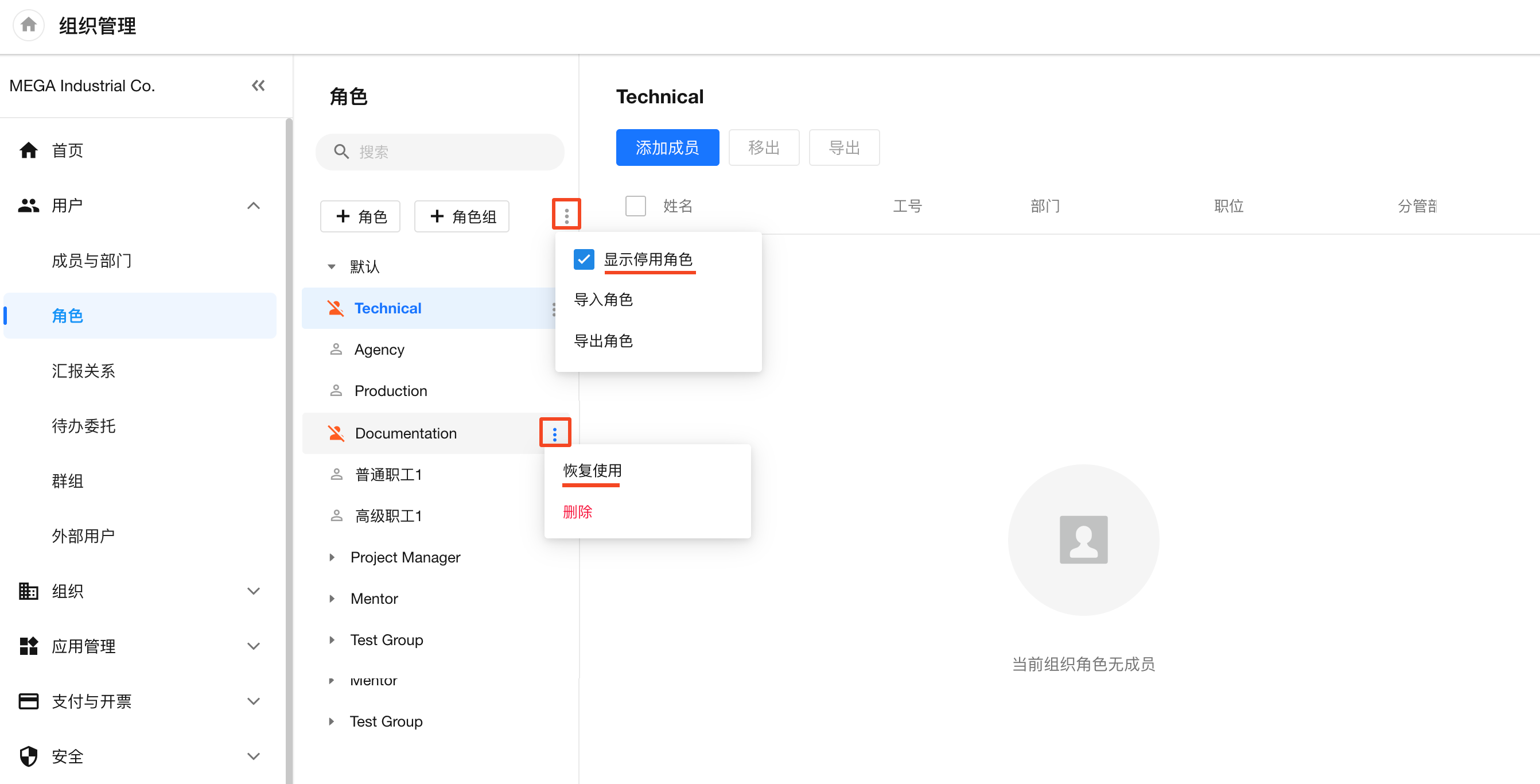 组织管理员可在角色列表查看并管理停用角色及其成员。