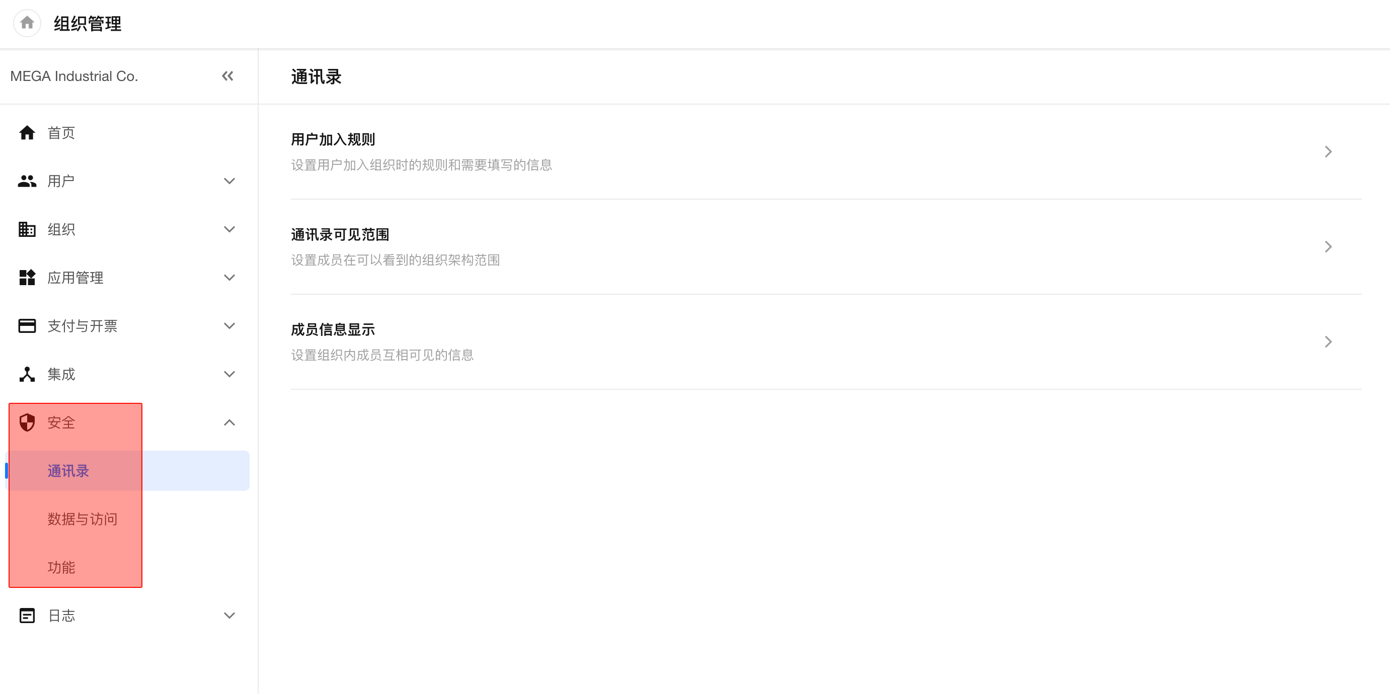 在**“组织管理 > 安全 > 通讯录 > 通讯录可见范围”**中,管理员可以根据组织架构的私密性要求,灵活设置成员查看通讯录的权限。