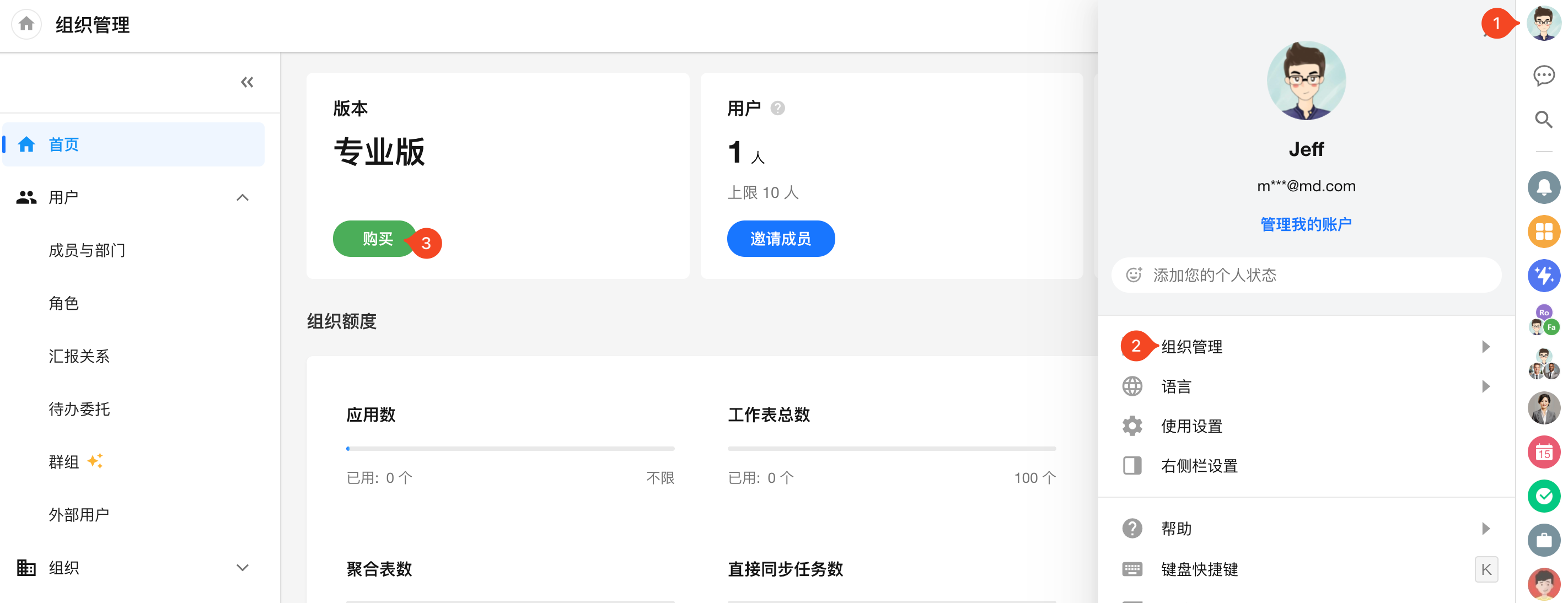 管理员在电脑端登录HAP,点击头像依次进入组织管理 > 首页, 点击【购买】/【续费】按钮,了解HAP高级模式的功能和收费情况。