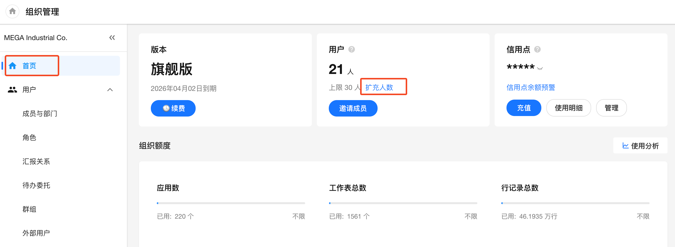 购买路径:管理员点击系统右上角头像依次进入>组织管理 >首页,在页面中点击【扩充人数】按钮,进入购买页面。