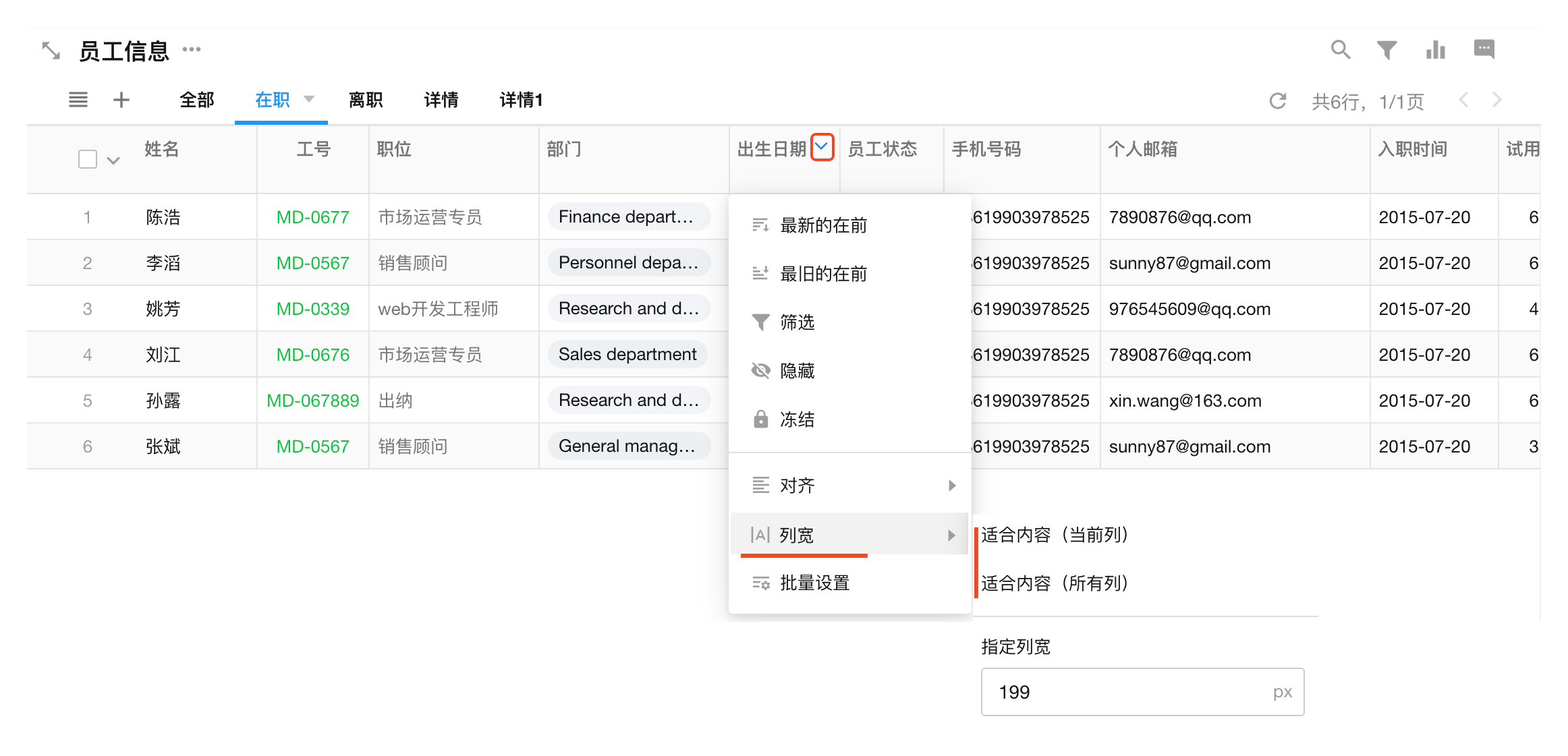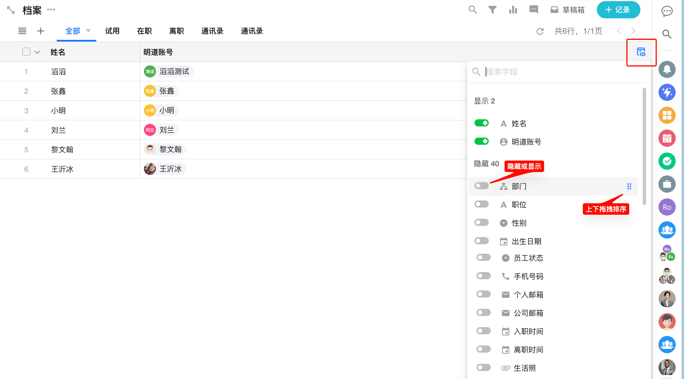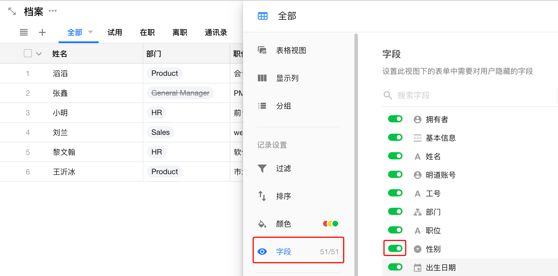 例如,在“在职”视图下查看员工档案时,离职时间这个字段是空的,也没必要显示,因此在这个视图下是可以隐藏的,离职时间在“离职”视图下显示即可。