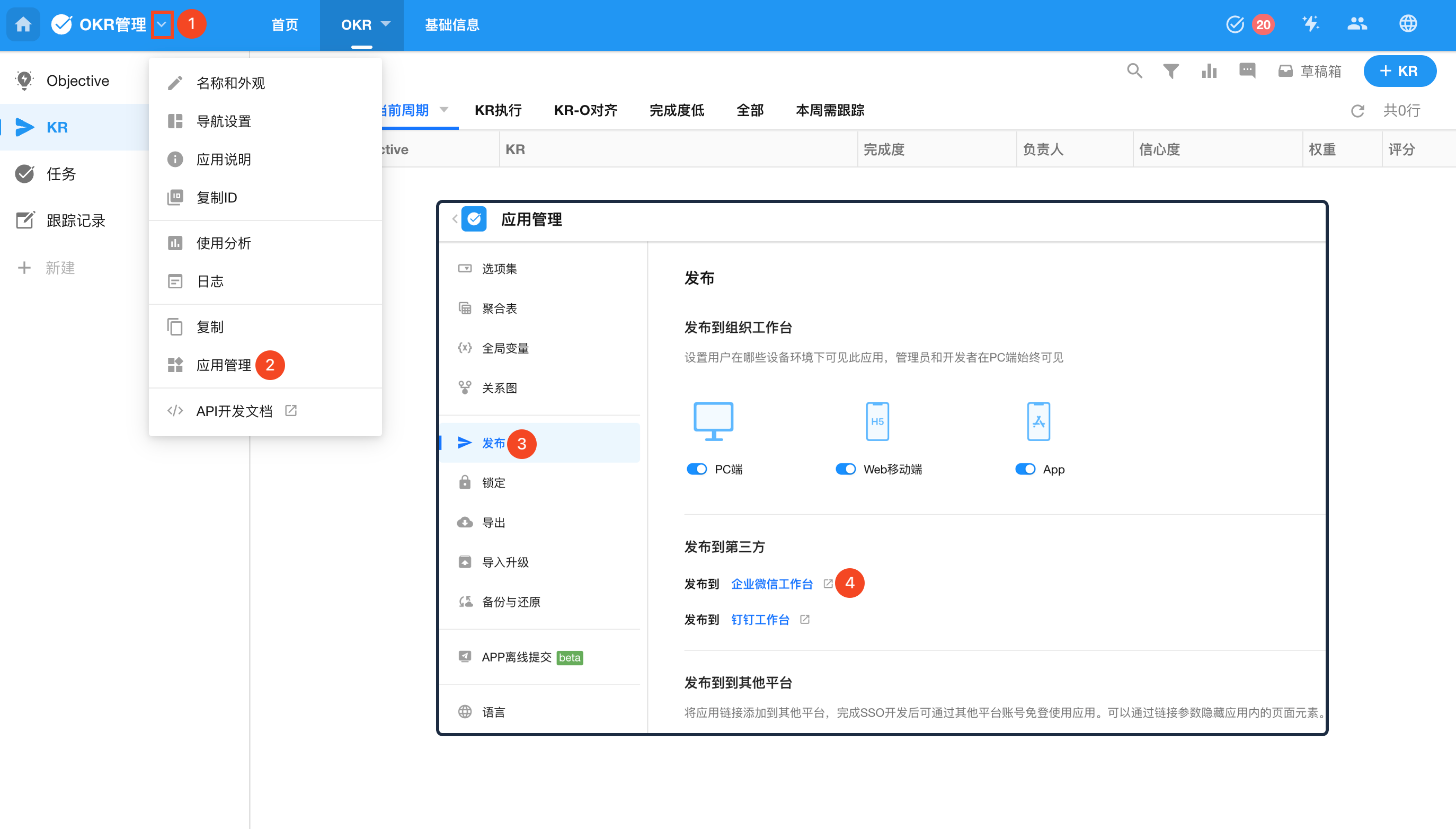 对接完成后,进入企业微信后台,通过 应用管理 > 应用 > 自建应用栏,找到对接应用OKR。然后可以修改图标、名称和描述。
