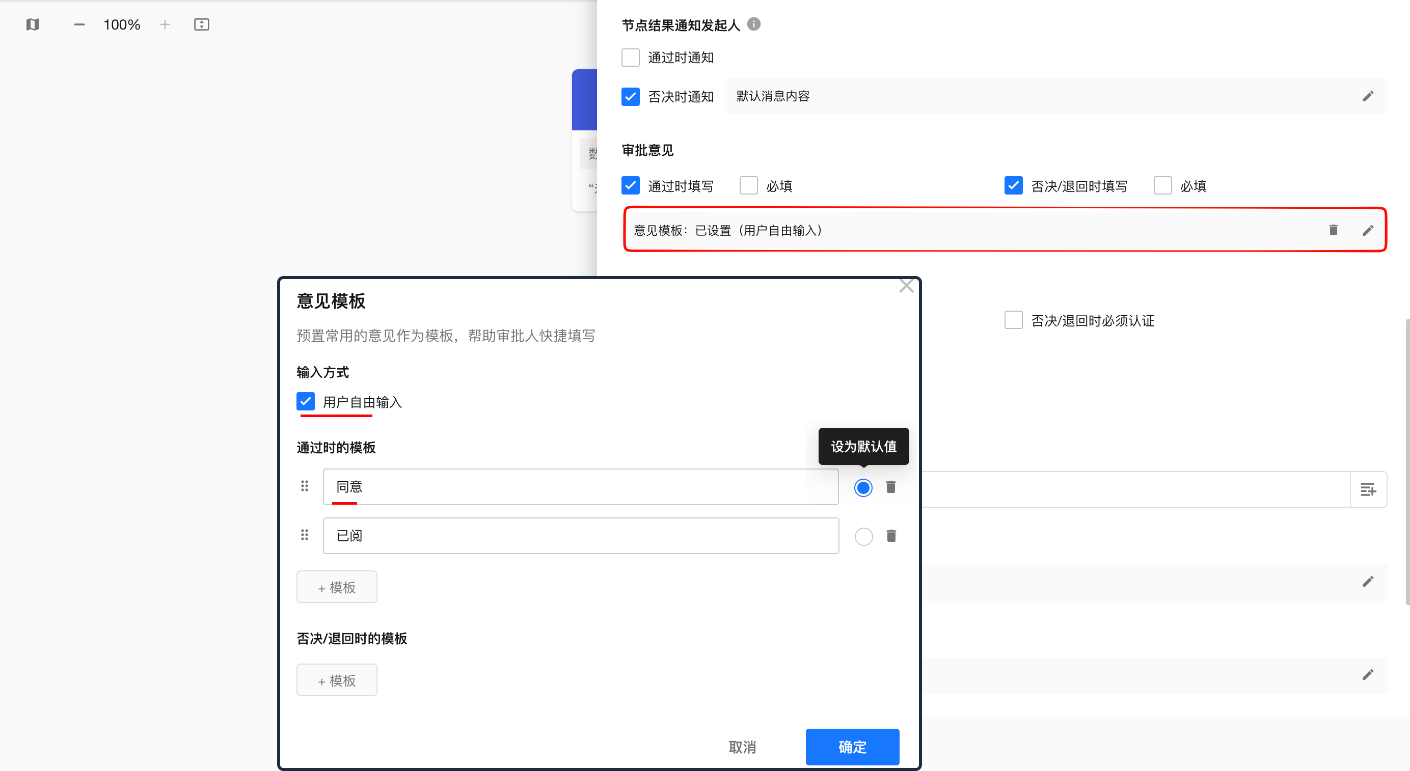• 设置流程的审批人和多人审批时的通过方式(会签、或签、按通过比例);
