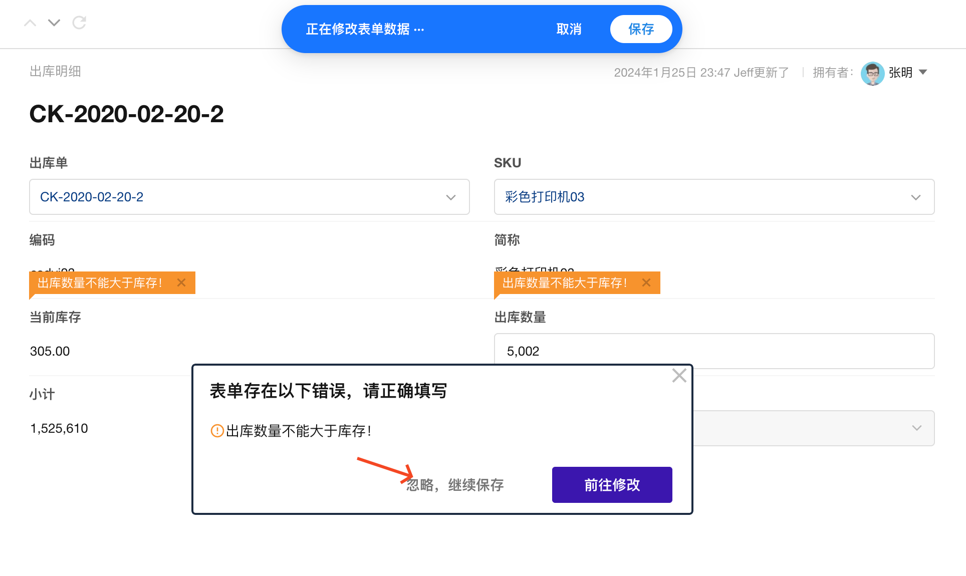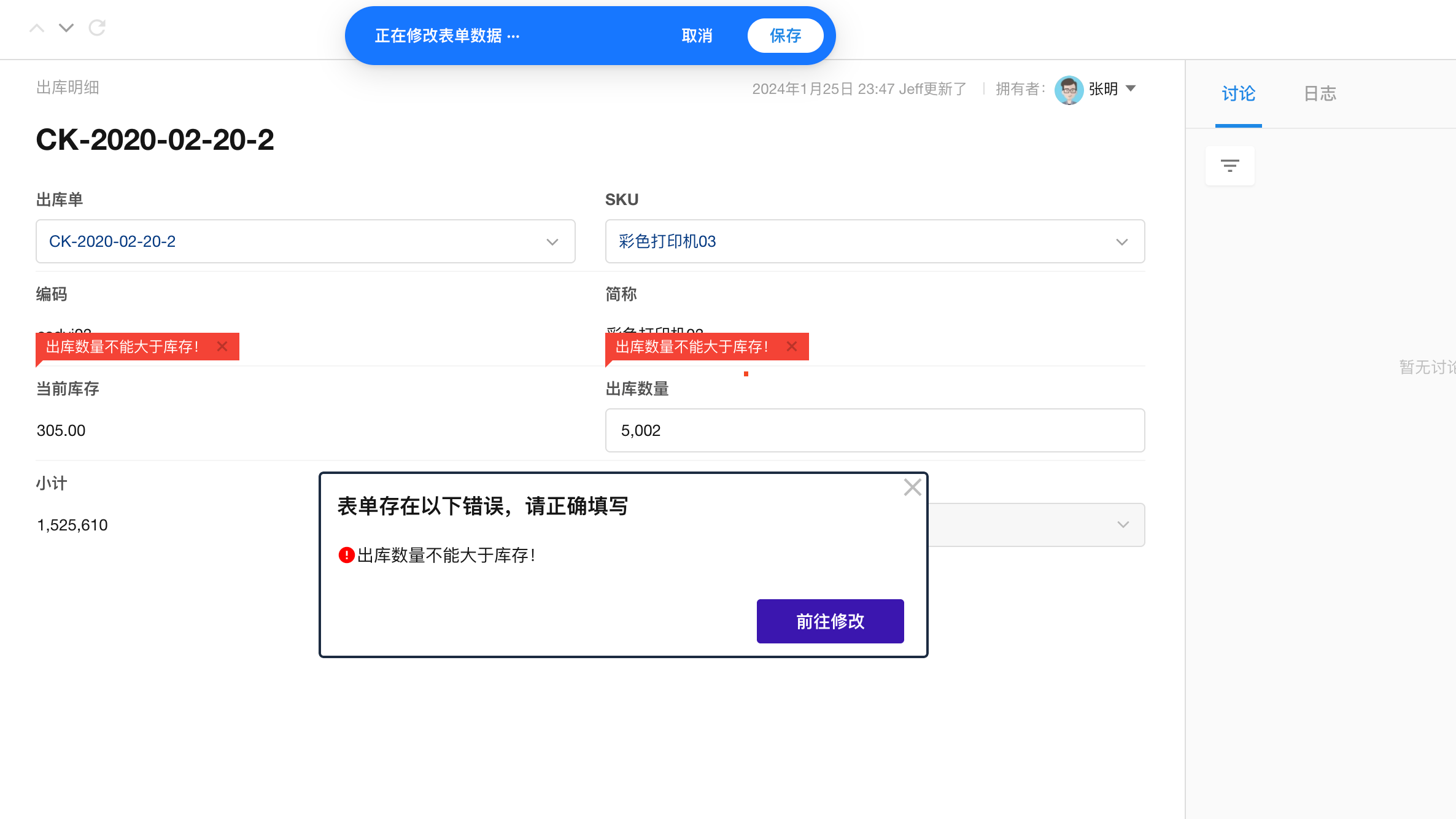 场景:在出库某个商品时,如果出库量大于商品当前的库存量,不能保存并提醒给用户。
