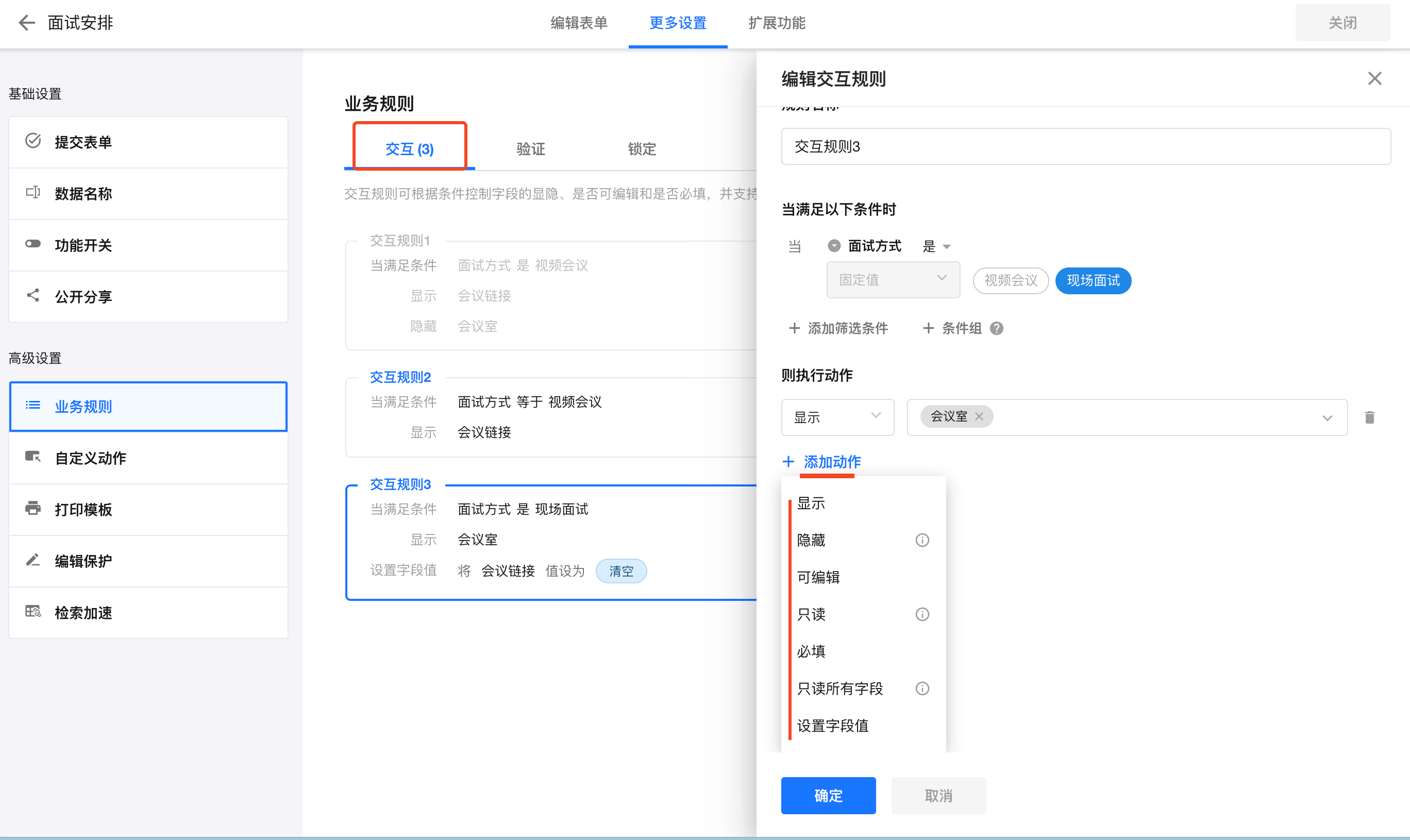 初学者可能会再配置1个条件,当面试方式等于现场面试时,隐藏或显示字段。其实这个条件可有可无。