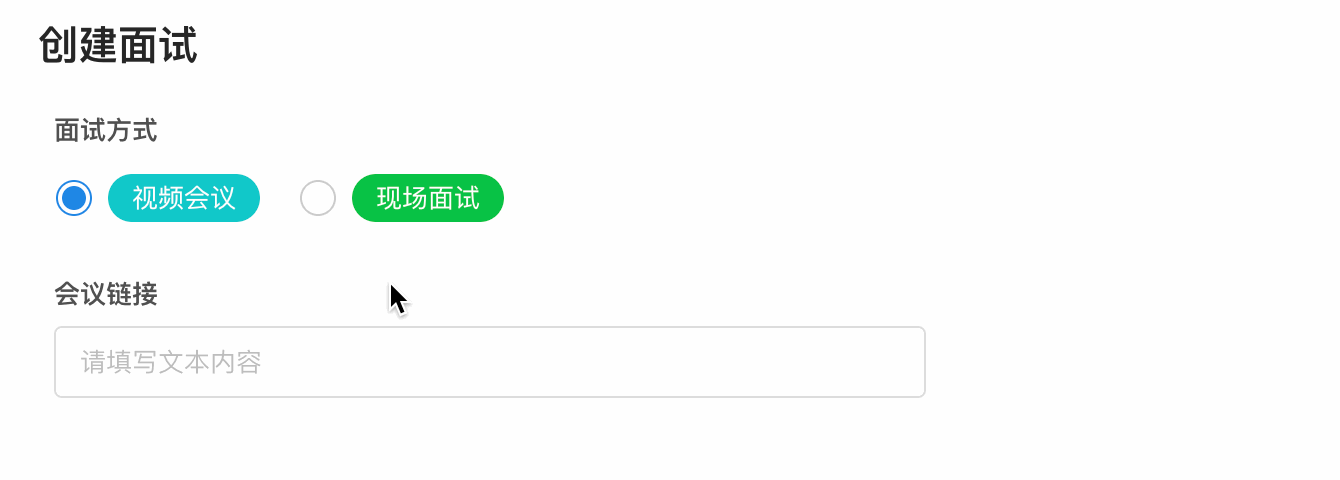 1、在安排面试时,如果是视频面试,就显示会议链接字段。如果选择现场面试就显示会议室字段,同时清空会议链接字段内容。