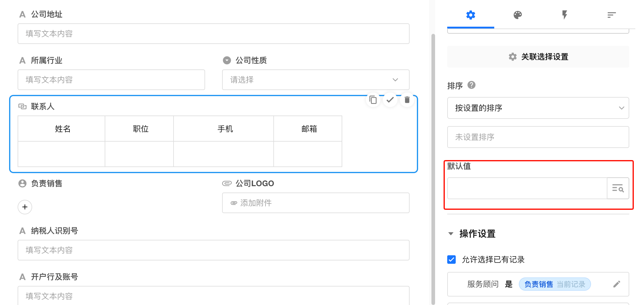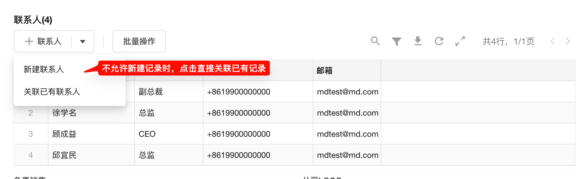 关联一条他表记录效果(一个联系人只能有一个客户公司)