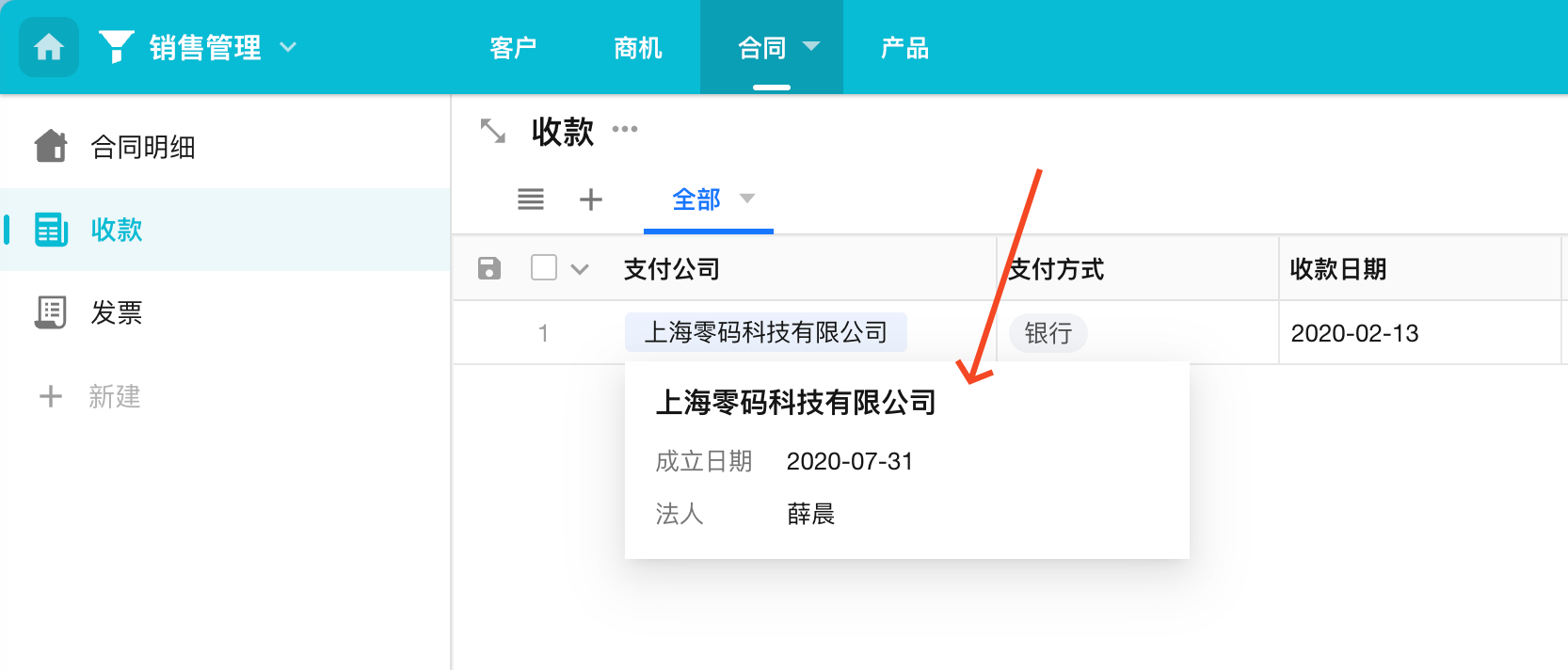 在视图下查看数据,若关联字段是单条的卡片模式或下拉框模式,鼠标放在关联字段时支持显示卡片。