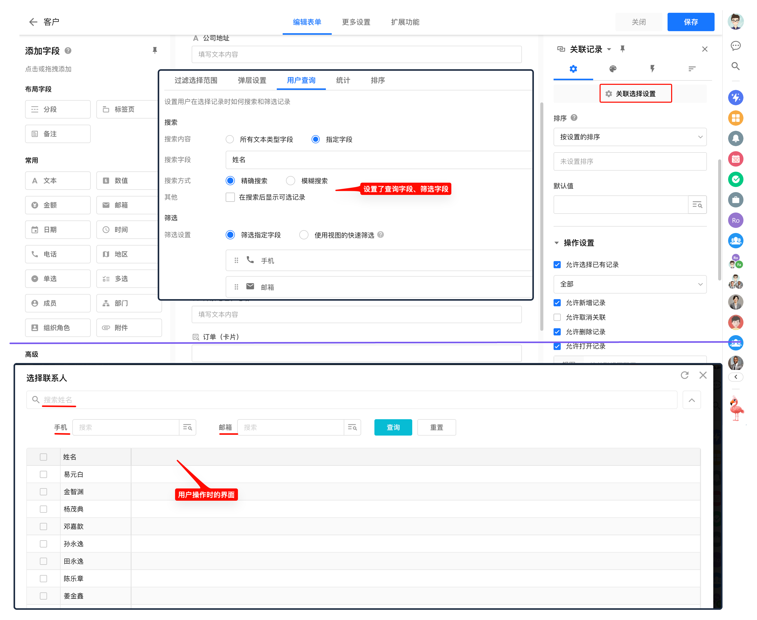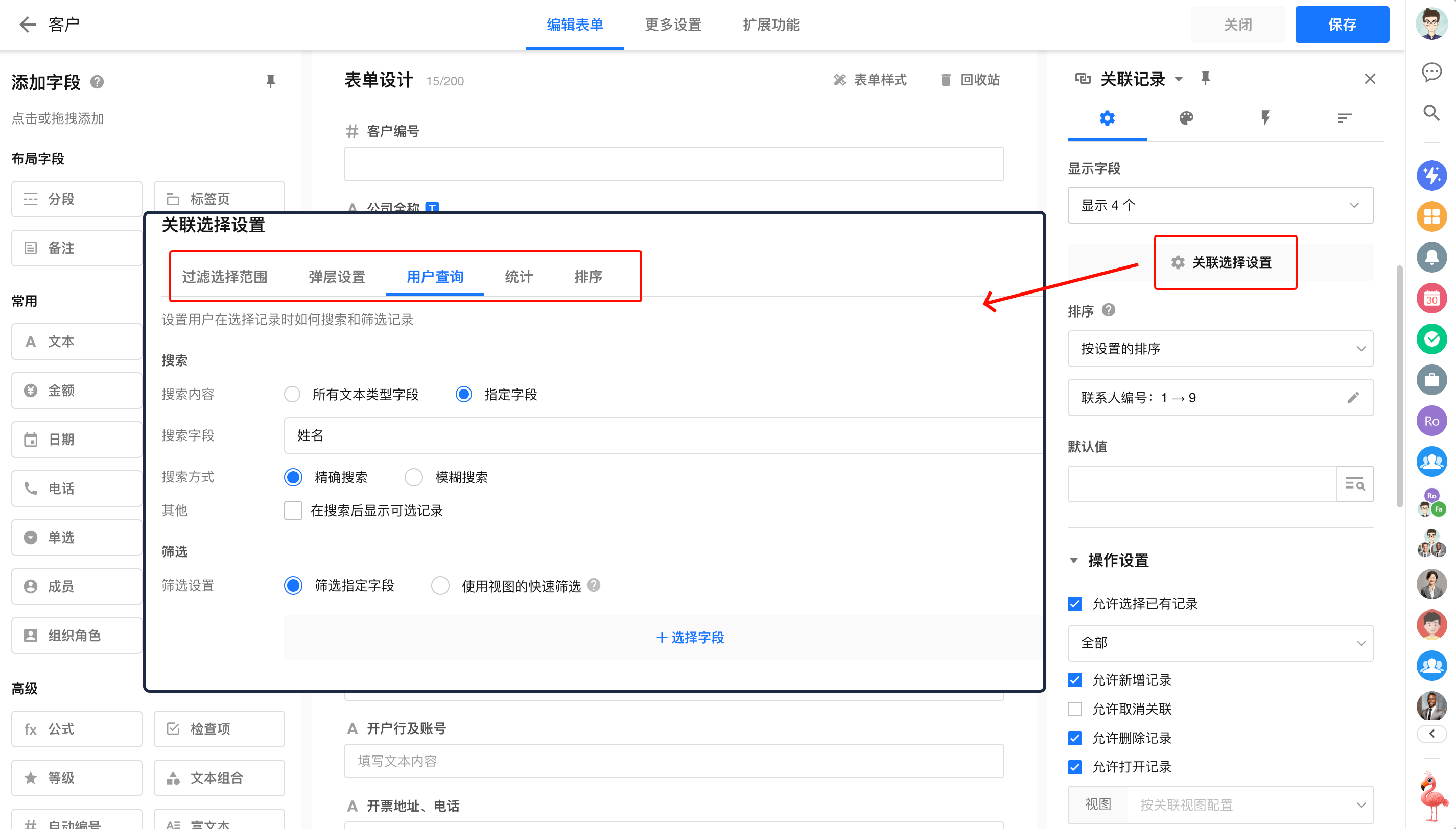在“关联选择设置”中配置用户在关联时待选记录的界面。如筛选范围、弹层设置(下拉框设置)、查询方式、显示字段、统计与排序。
