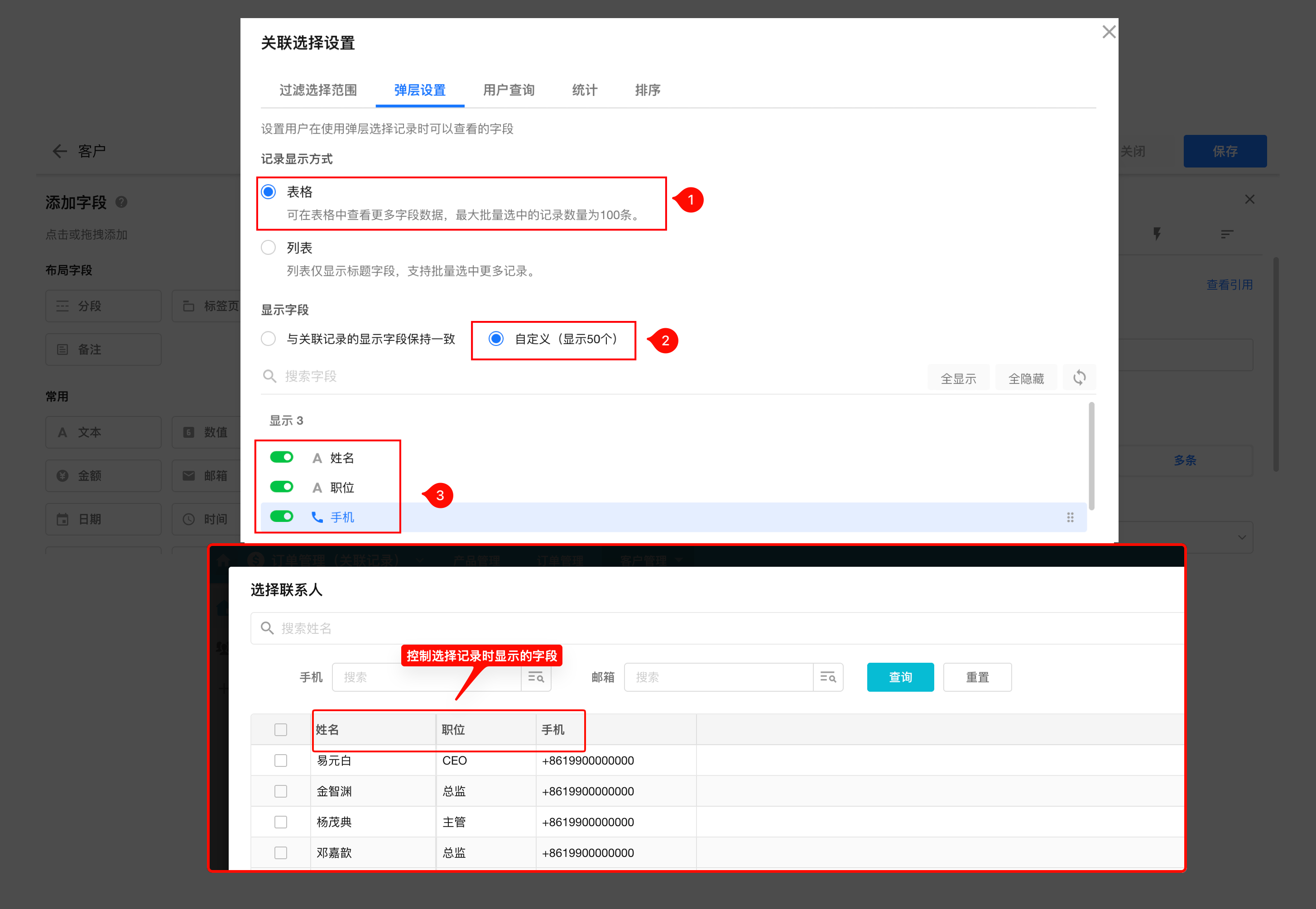 选择与呈现记录时,除标题外可展示更多字段,并支持拖拽排序。