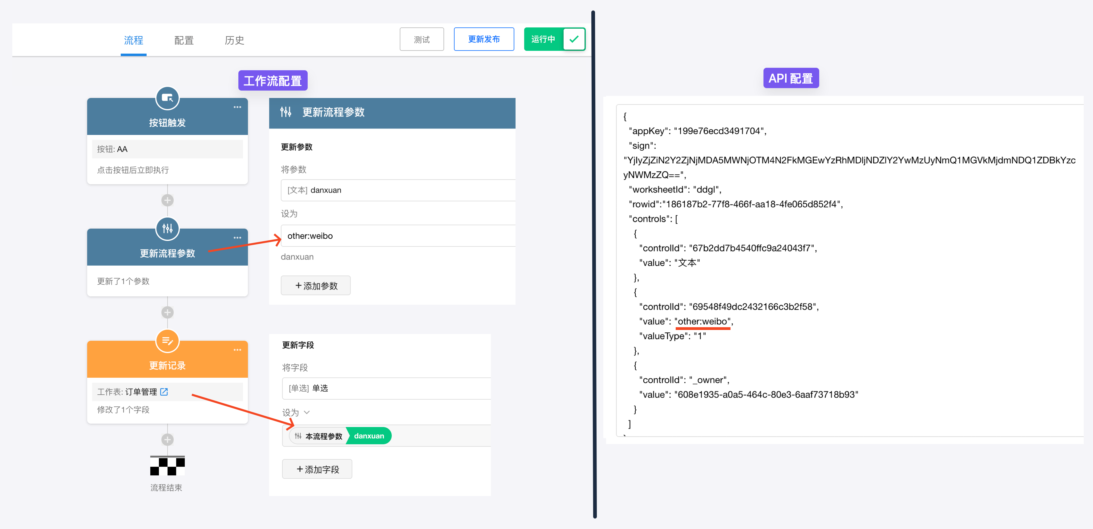 具体配置如下,拼接后的内容可以来自文本字段或流程参数。