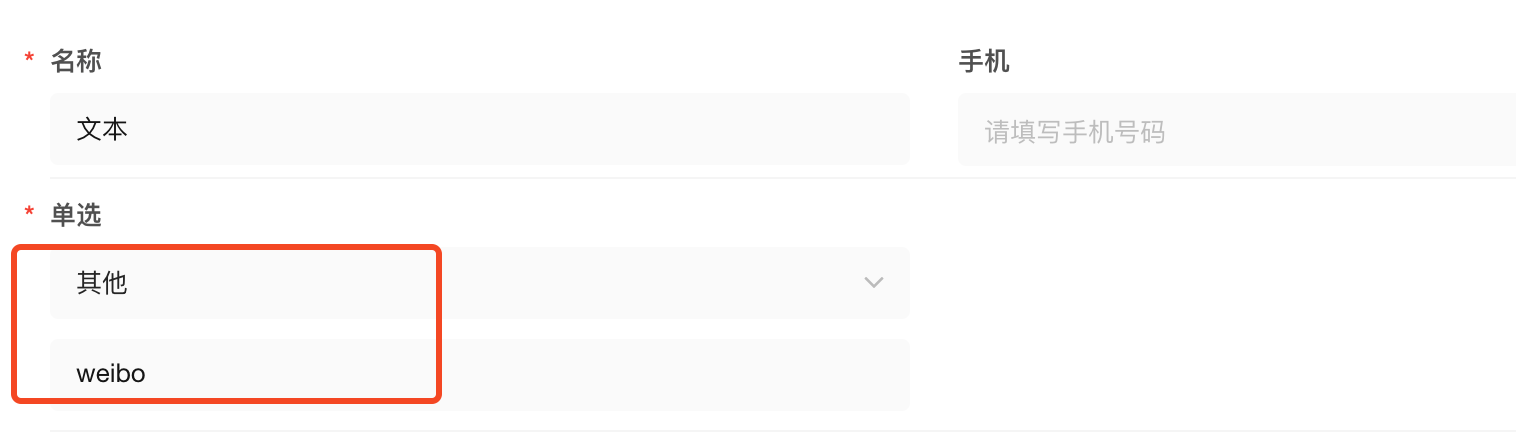 当用户选择“其他”项时,会显示出补充内容输入框,补充信息输入框支持自定义引导内容。