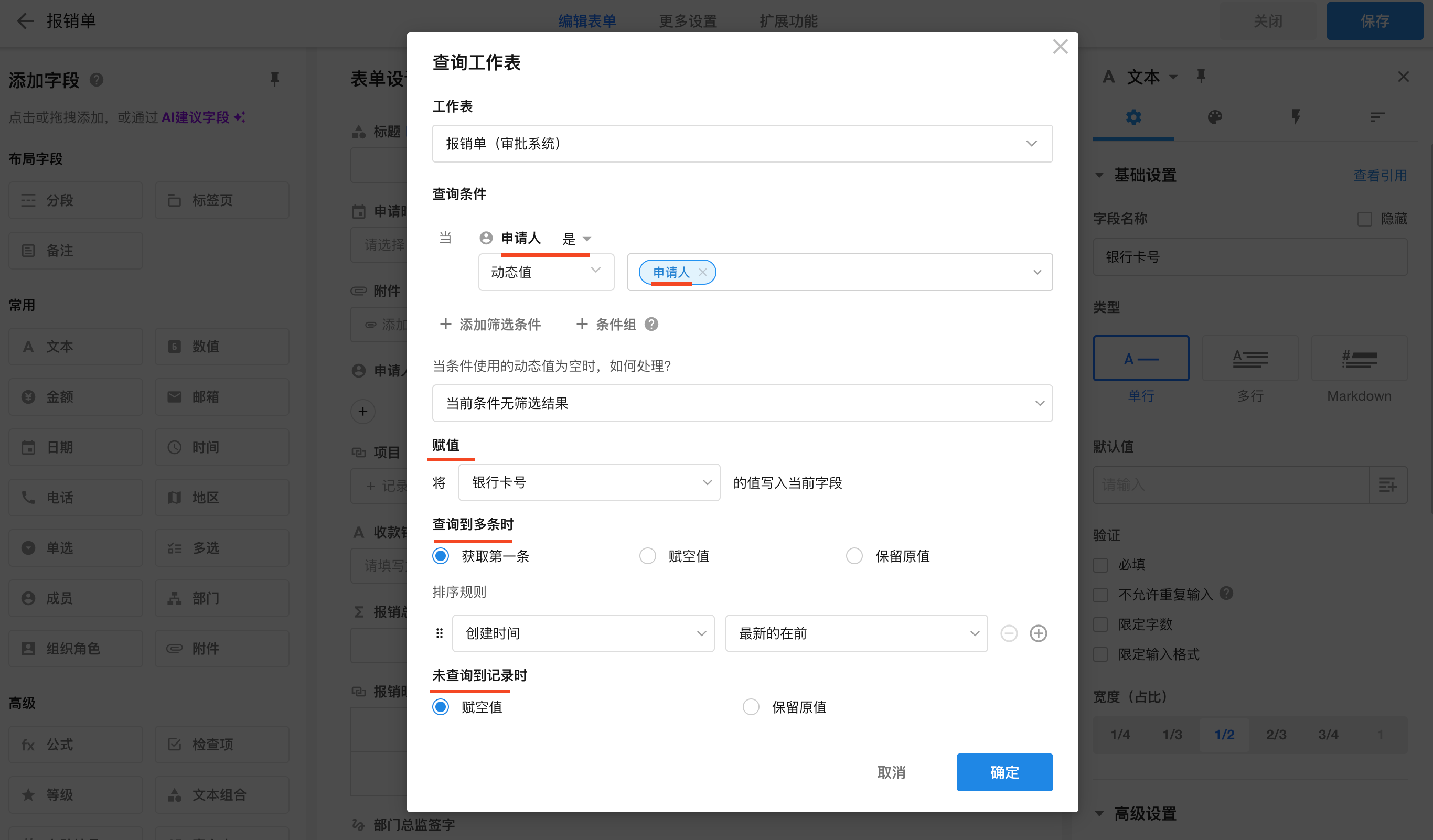 功能: 创建记录时,可能需要知晓本表或其他表中已有的记录数据,就可以通过一个查询条件,从指定工作表中查找,找到后将数据写入到字段。