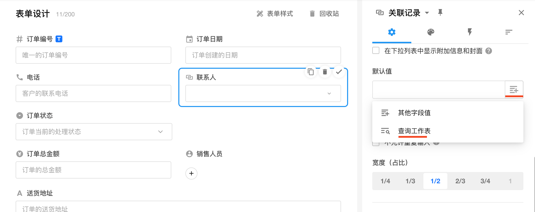 1) 为联系人字段配置默认值,选择查询工作表的方式