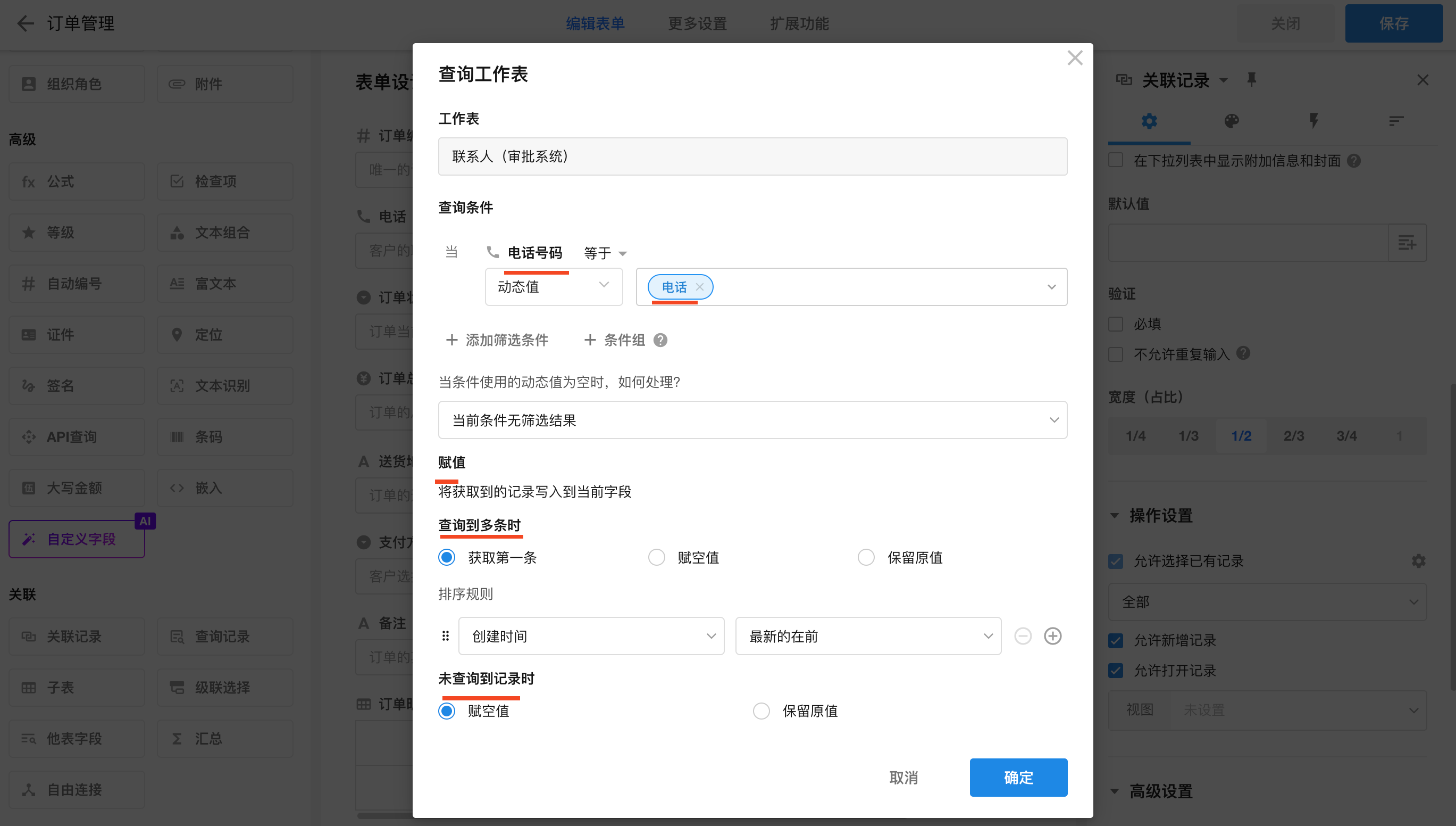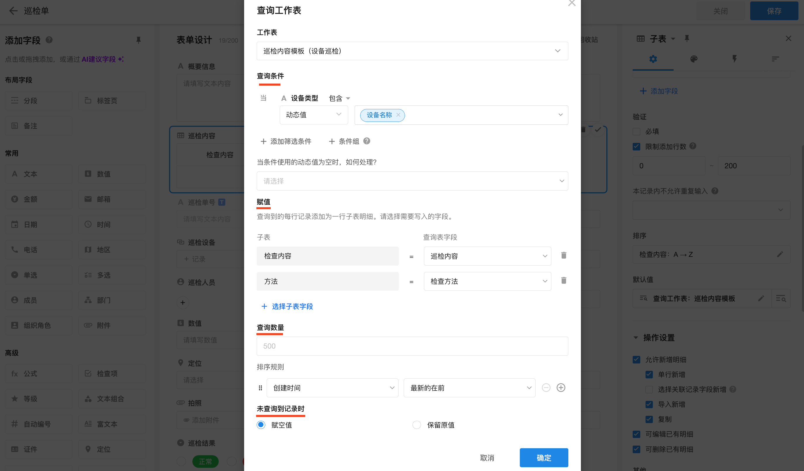 功能: 创建记录时,可能需要知晓本表或其他表中已有的记录数据,就可以通过一个查询条件,从指定工作表中查找,找到后将数据写入到字段。