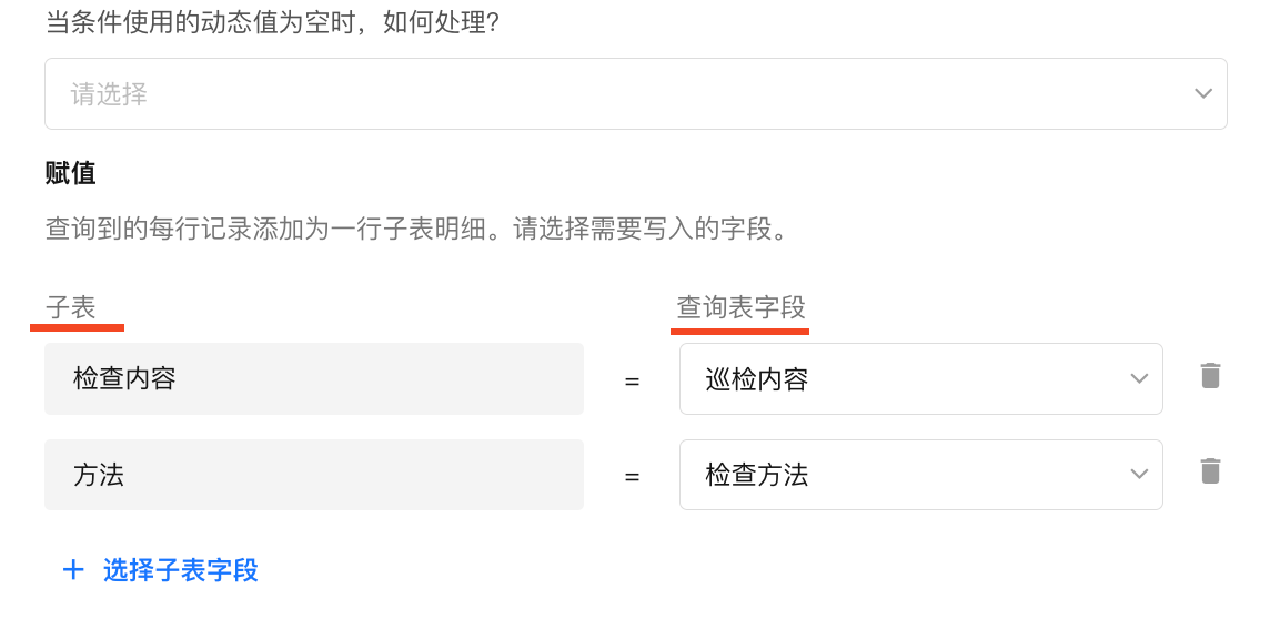选择查询记录中字段值写入到当前字段。 最后结果有三种可能:赋空值、保留原值、查询到的值。
