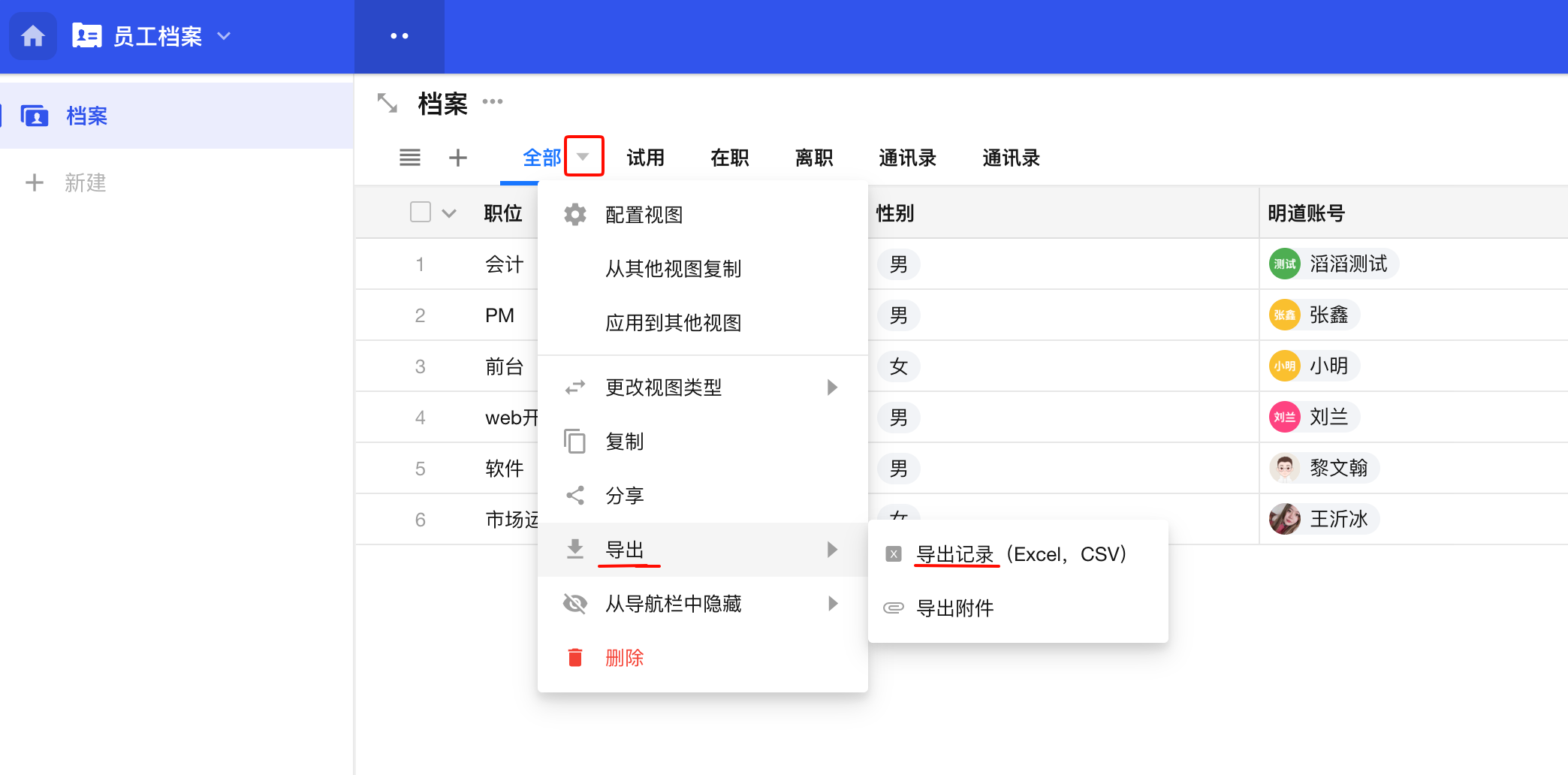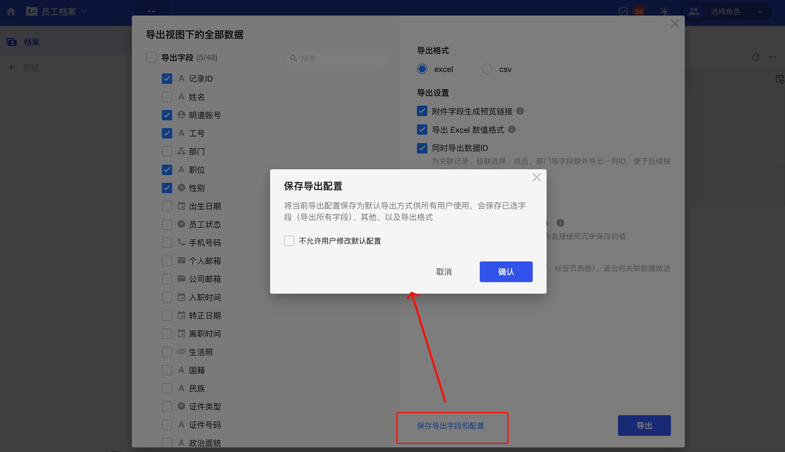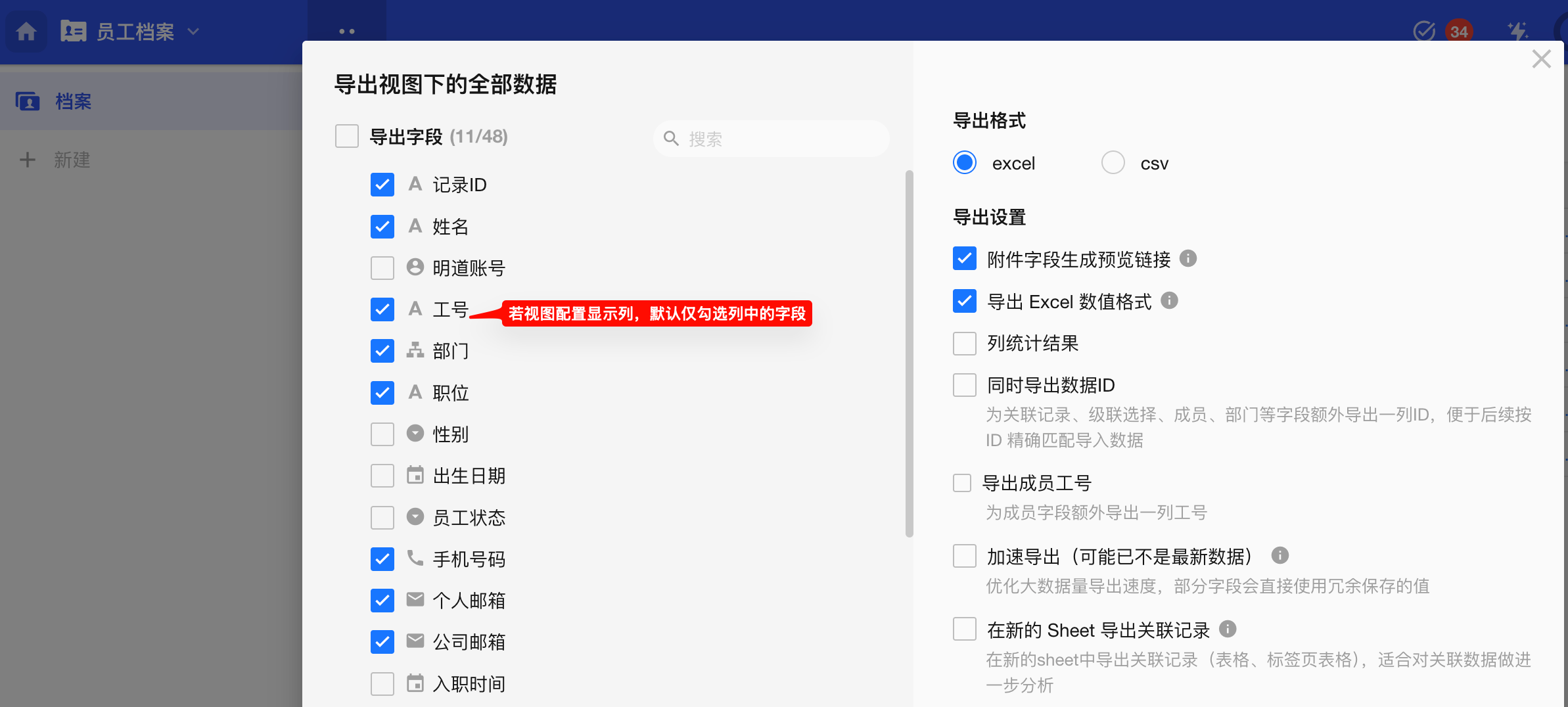 管理员可以导出视图下所有的字段,普通人员仅可导出可见字段。
