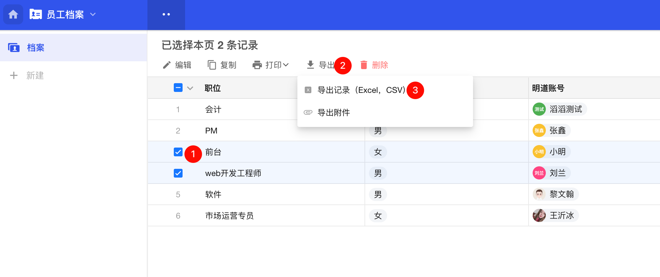 在表格视图下,勾选需要导出的记录 > 操作栏选择“导出” > 选择“导出记录”