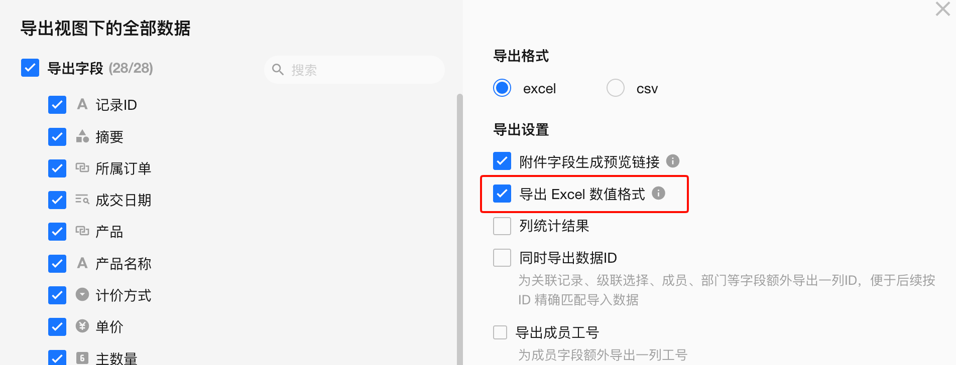 导出时勾选“导出为Excel数值类型”,数值、金额、公式(输出类型为数值)、汇总(输出类型为数值)、等级等字段,可导出为Excel数值类型。 若不勾选,数值类型的字段导出为文本格式,会导致在EXcel中不能参与计算。