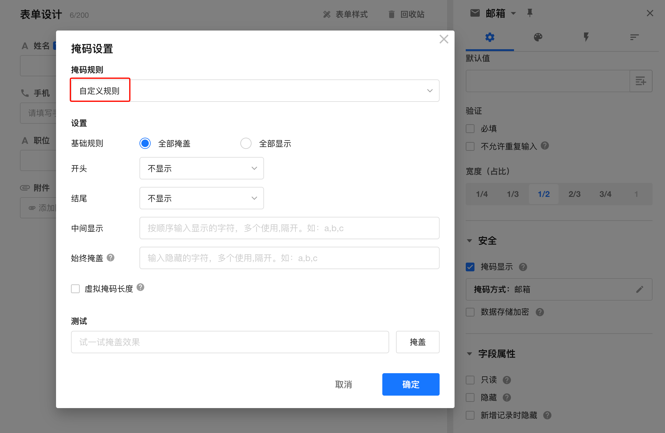 支持掩码显示的字段有: 单行文本、数值、金额、手机/座机、邮箱、证件。
