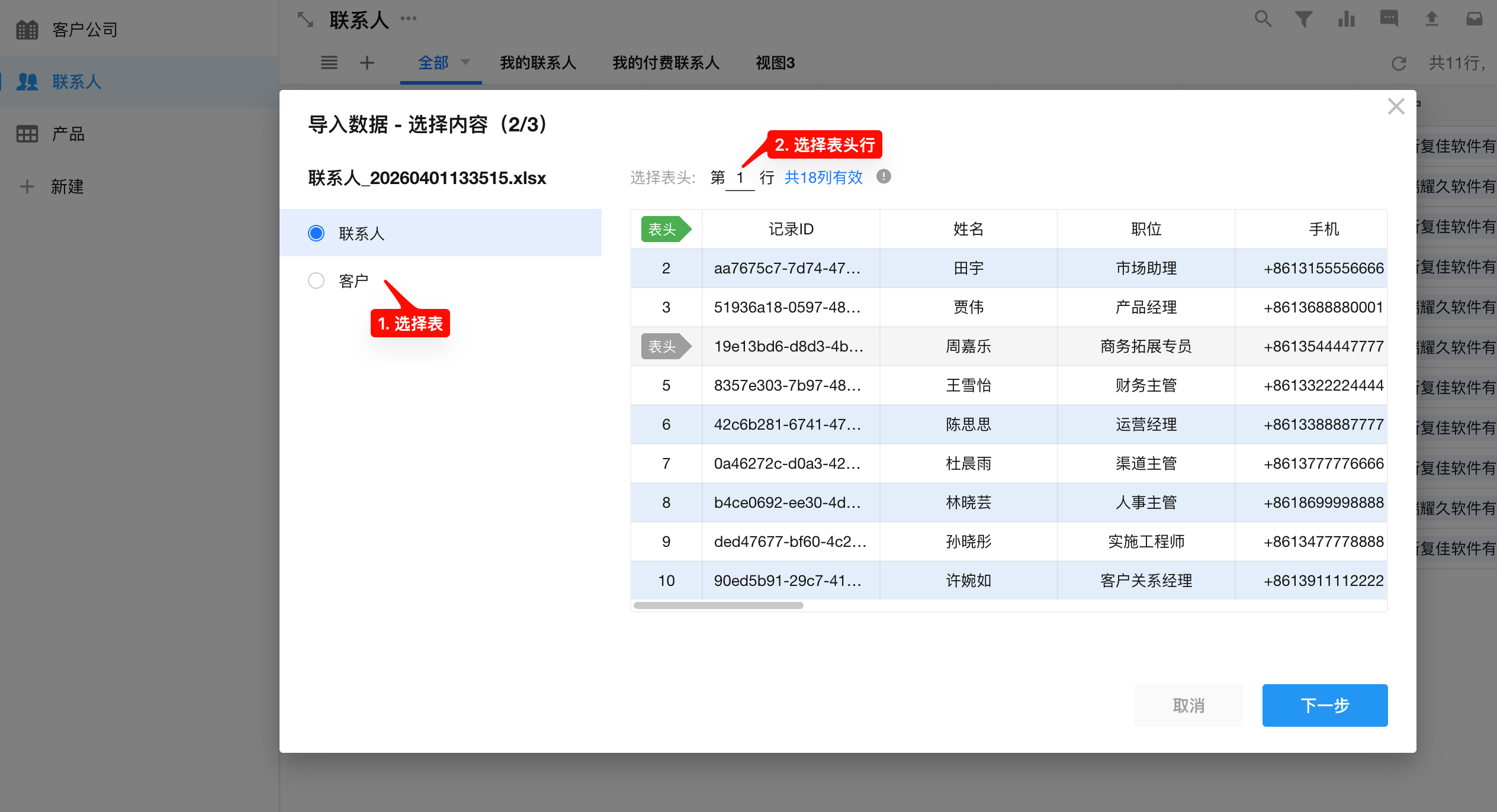 选择一行作为表头,表头下方的数据作为内容将导入到工作表中(表头信息不会导入)。表头不能为空,如果两列之间有空的表头,则会导入失败。