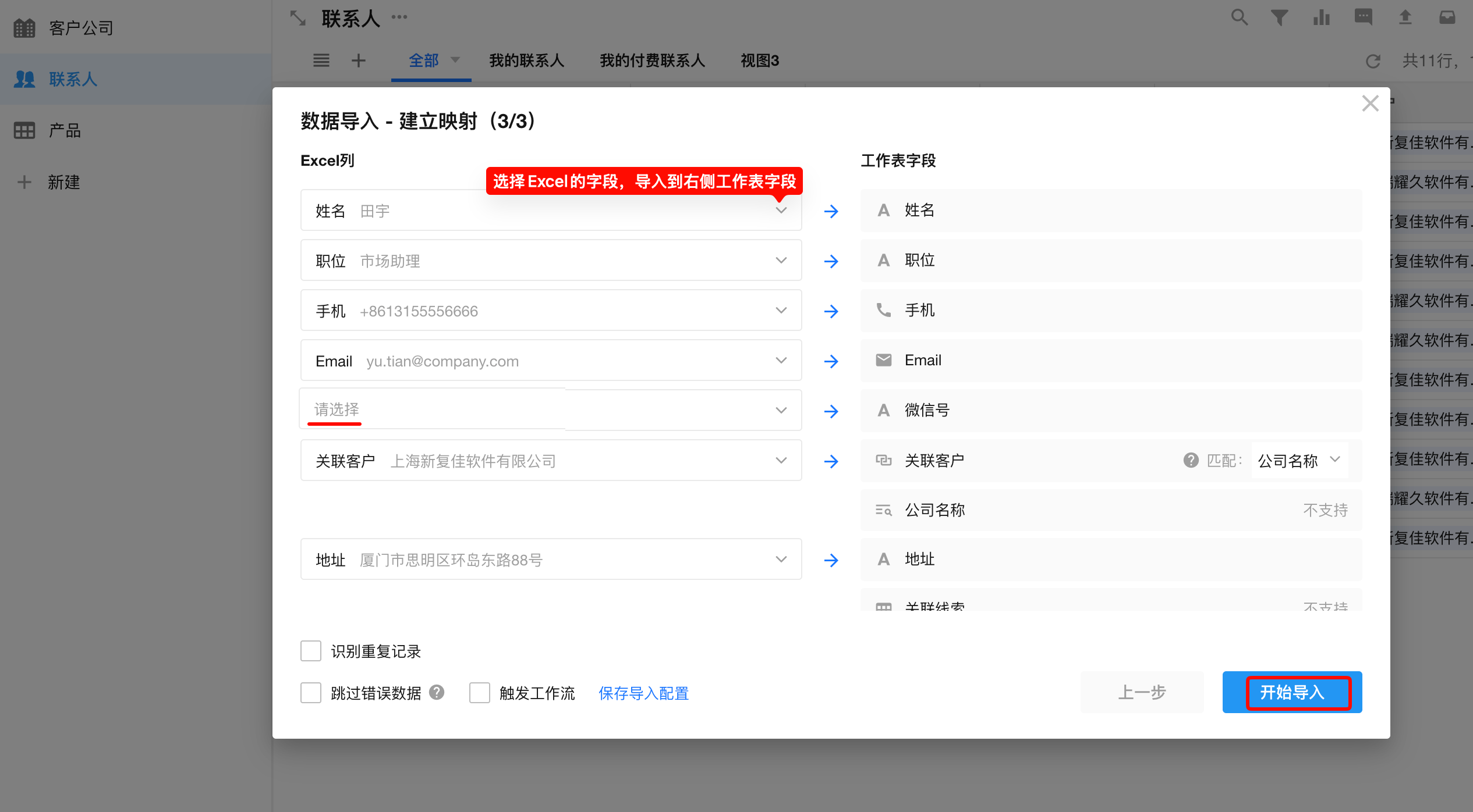 不导入处理: 若某字段不需要导入,在Excel列设置为“请选择”
