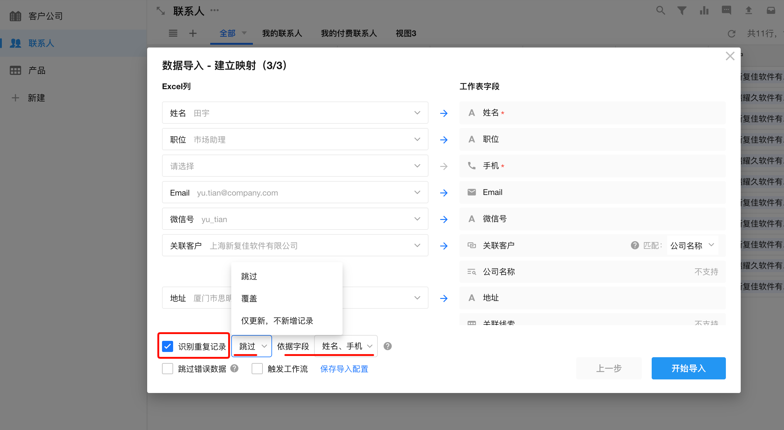 勾选"识别重复记录 "后,系统会依据您指定的“依据字段”(如工号、手机号等唯一 标识)来判断 Excel 数据与工作表已有数据的关系,并提供三种处理方式: