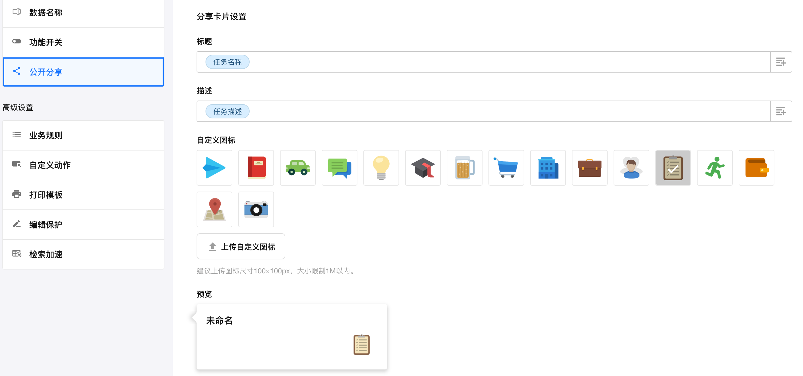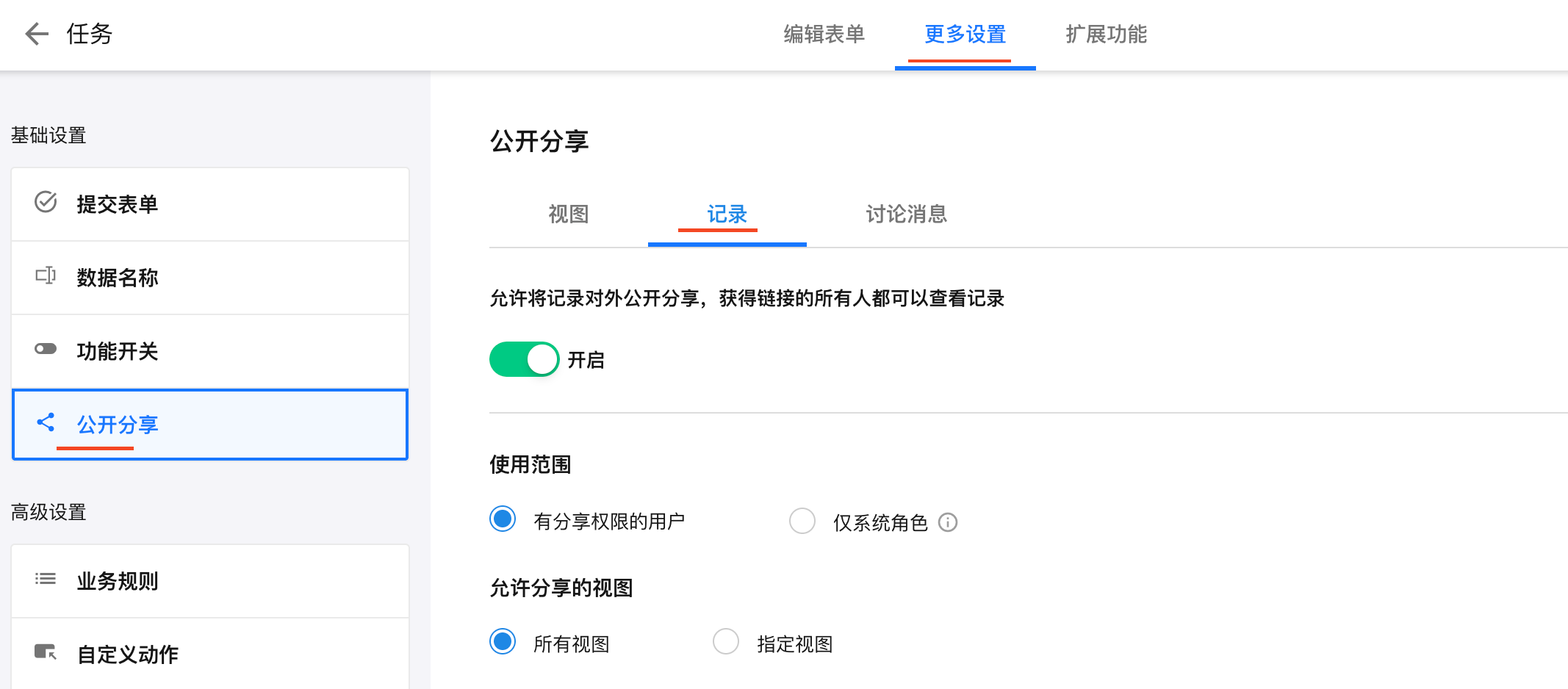 在“编辑表单” - “更多设置” - "公开分享" 页面的"视图"页签中,可以开启或关闭视图的分享功能。