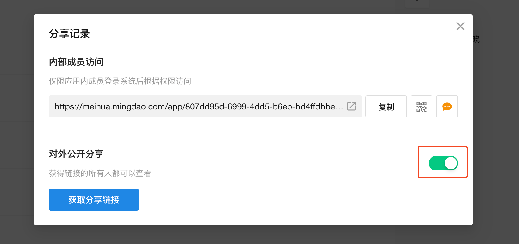 工作表的视图、记录支持对外分享,获得链接的所有人都可以查看视图数据和记录详情。