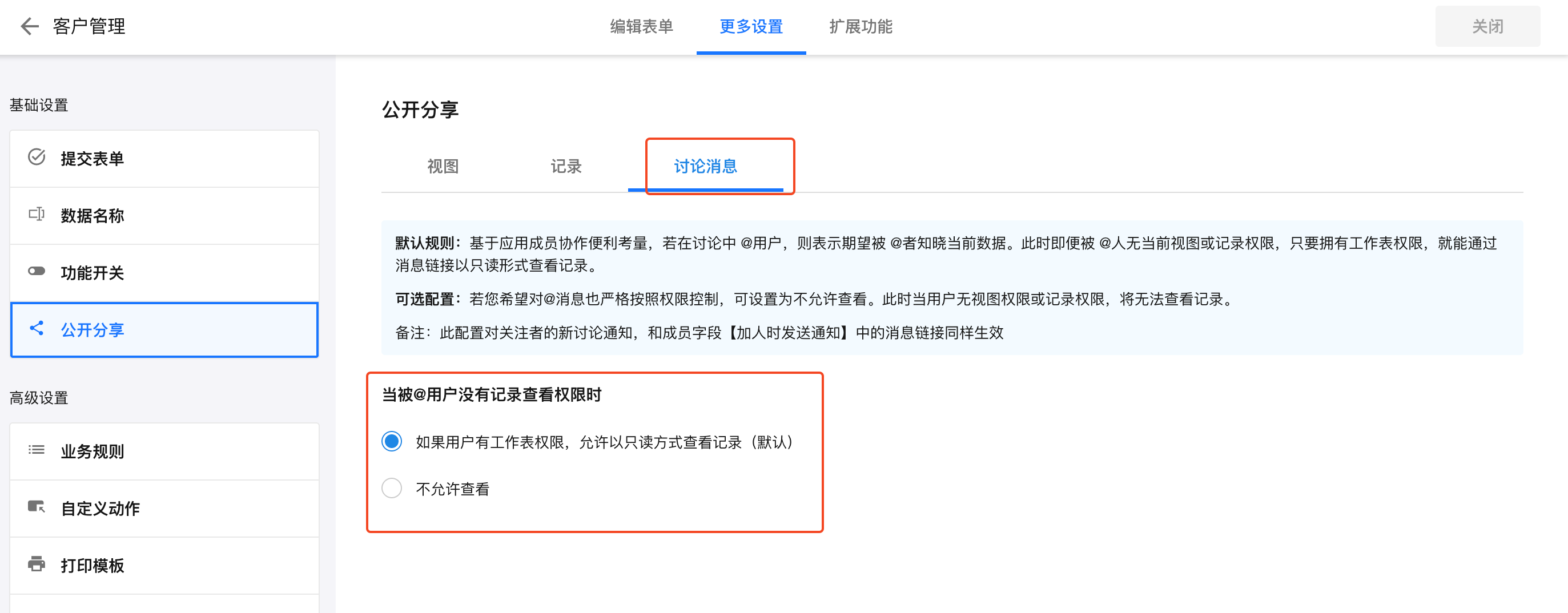 记录中@别人时,可以基于数据安全,让非成员是否可见记录详情。
