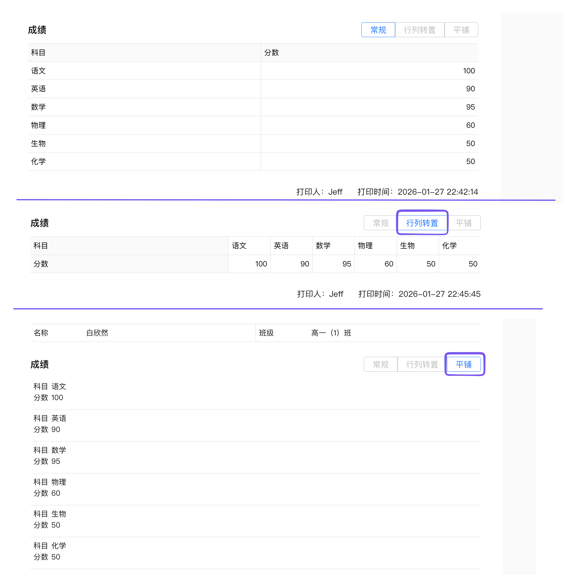 子表、关联表打印时支持常规、行列转置和平铺3种模式。