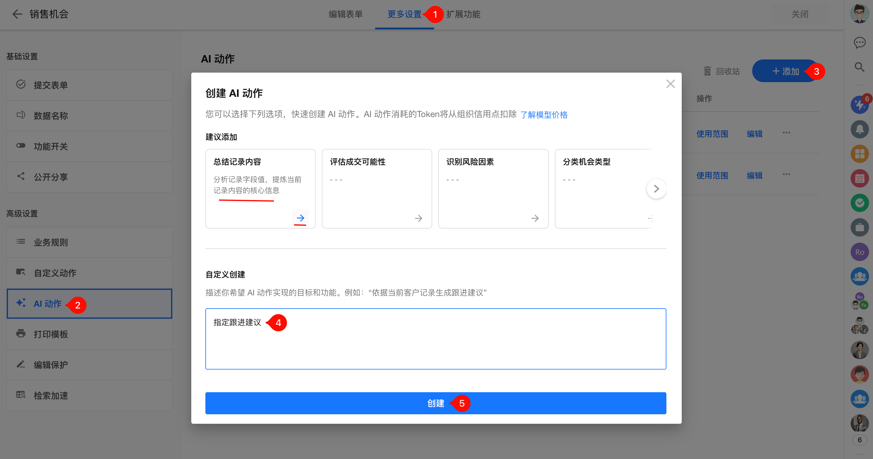 进入【表单配置】 > 【更多设置】 > 【AI 动作】,页面中点击【+添加】按钮,在弹层中输入您希望实现的目标,最后点击“创建”按钮,AI 会基于描述填入必要信息并创建 AI 动作。