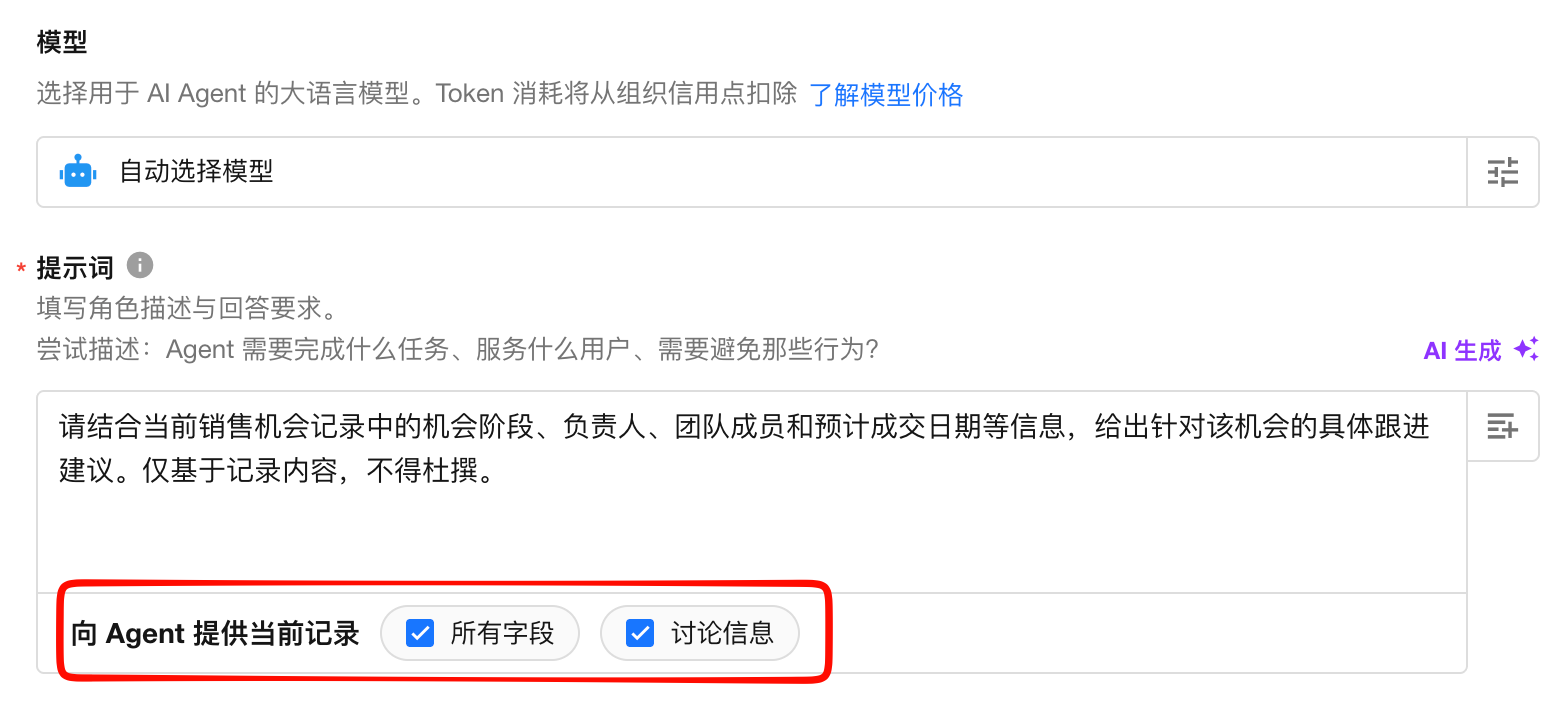 特别功能:在提示词配置中,可勾选“提供当前记录的所有字段与讨论”,用于全量分析该记录。