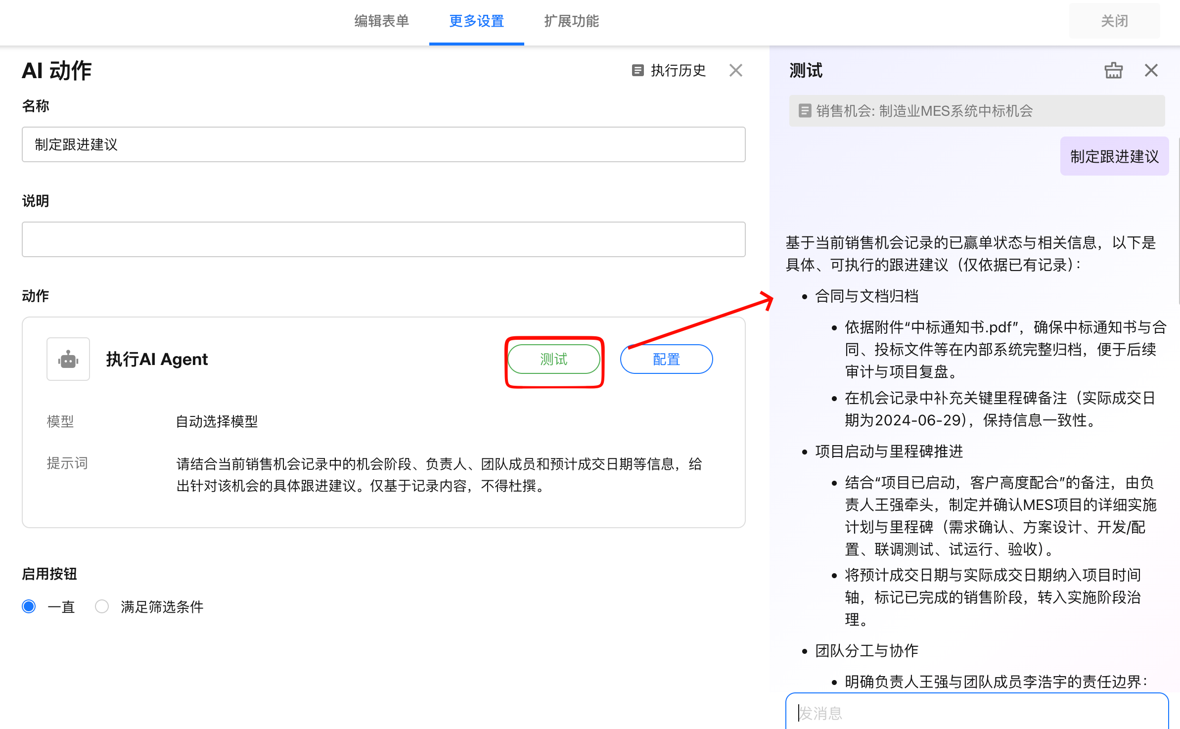 在【动作】卡片点击【测试】,选择一条记录即可快速验证配置效果。