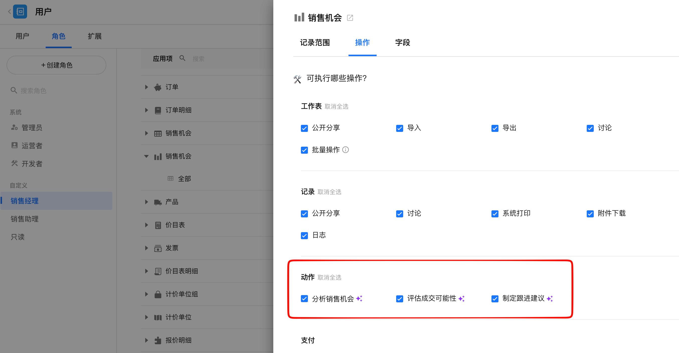 在【角色权限】>【分发有选择的应用项】中,配置当前角色可使用的 AI 动作。