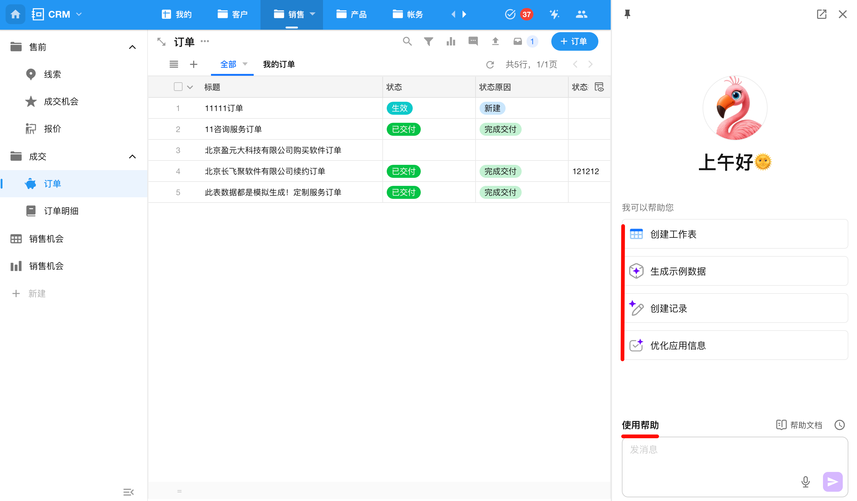 在任一工作表下打开 Mingo,点击“生成示例数据”。 当前视图无数据时,页面同样会显示“生成示例数据”。