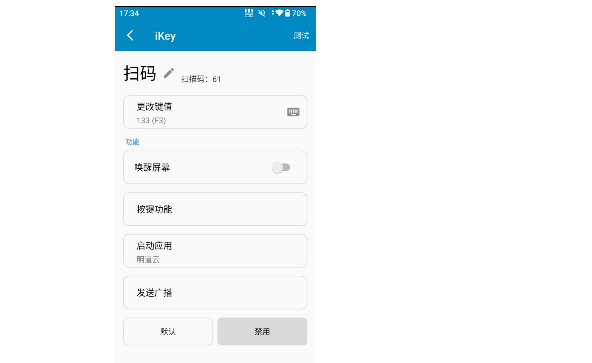 按键设置中配置发送广播模式,广播 action的值为:com.mingdao.PDA_Btn_Click_Action