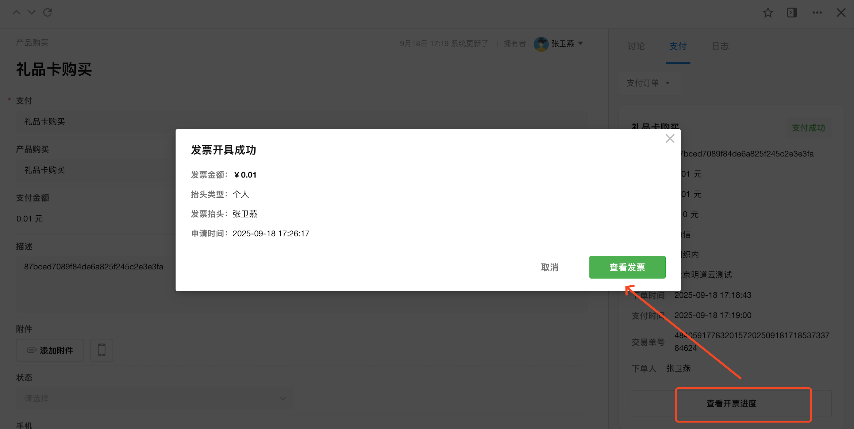 - 工作表记录付款成功后,可在记录详情右侧支付卡片点击立即申请开票