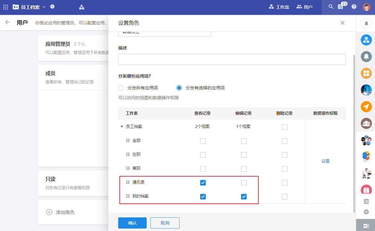 前麵需求中,我們可以得齣:HR可以看到所有視圖,可編輯所有記錄。 那這個權限幾乎可以和管理員差不多。如果您還希望HR可以新建工作錶,創建視圖,配置工作流,那麼就直接加入到應用管理員即可。 如果不希望HR可以調整應用,隻需管理數據,那麼可以單獨配置一個角色。