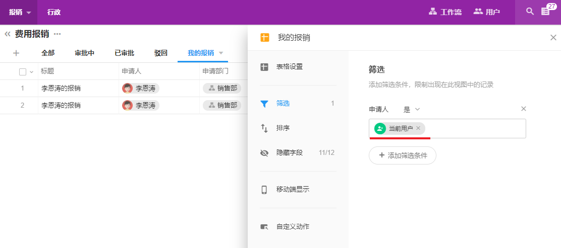 可以建立一個《我的申請》視圖, 這個視圖下可以看到所有我提交的報銷申請。篩選條件隻需 配置申請人或者創建人 是當前用戶即可。