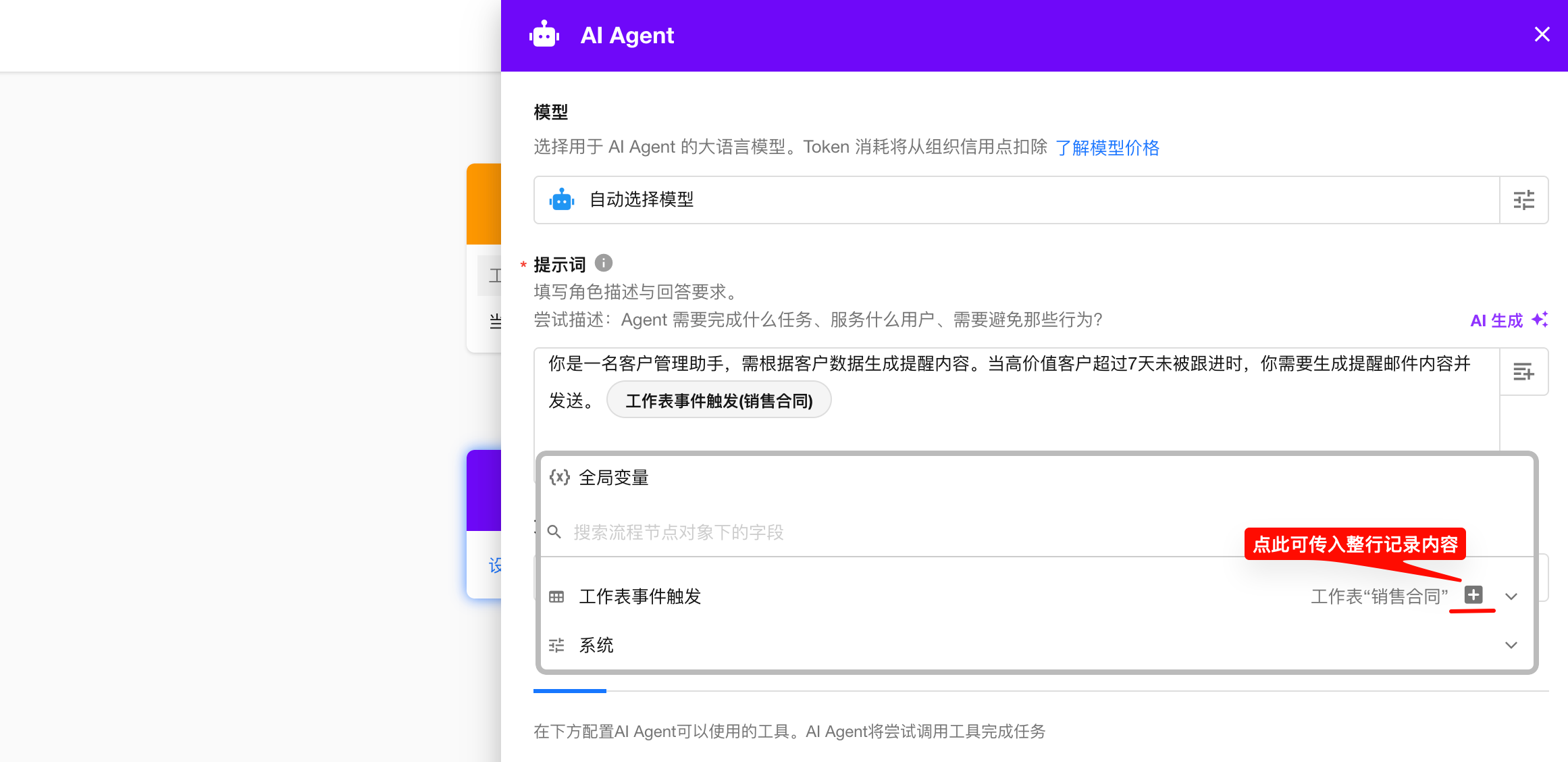 当 AI Agent 调用了「查询记录」「新增记录」「更新记录」等工具,且设置了工作表范围,后续节点可引用处理记录的字段值。