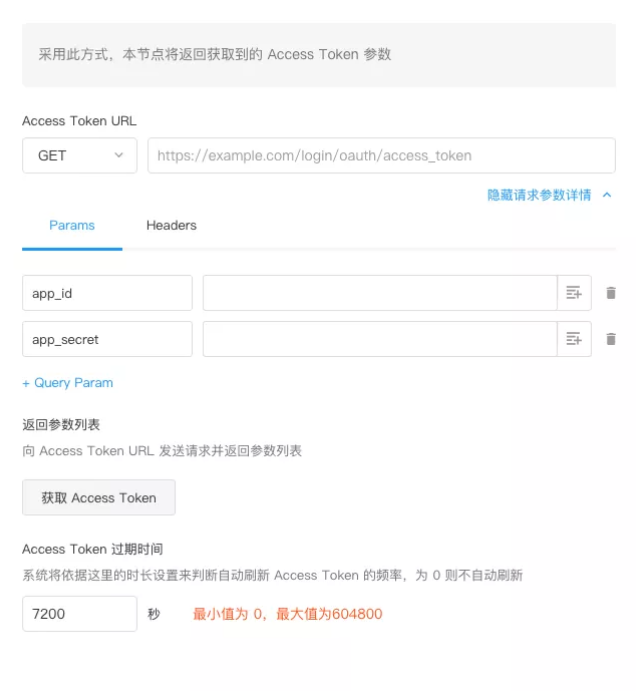 2、 請求參數詳情可以隱藏和顯示(圖上是顯示後的樣式)。 URL參數配置,默認配置 Params 參數名 app_id 和 app_secret;