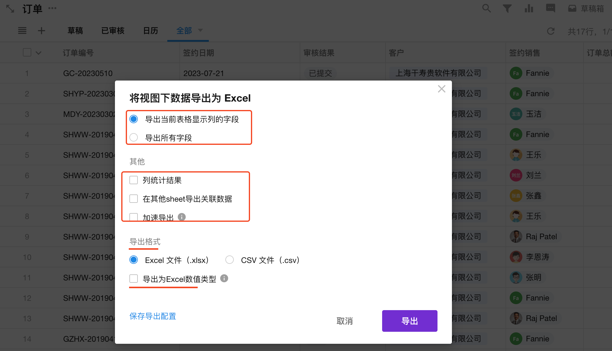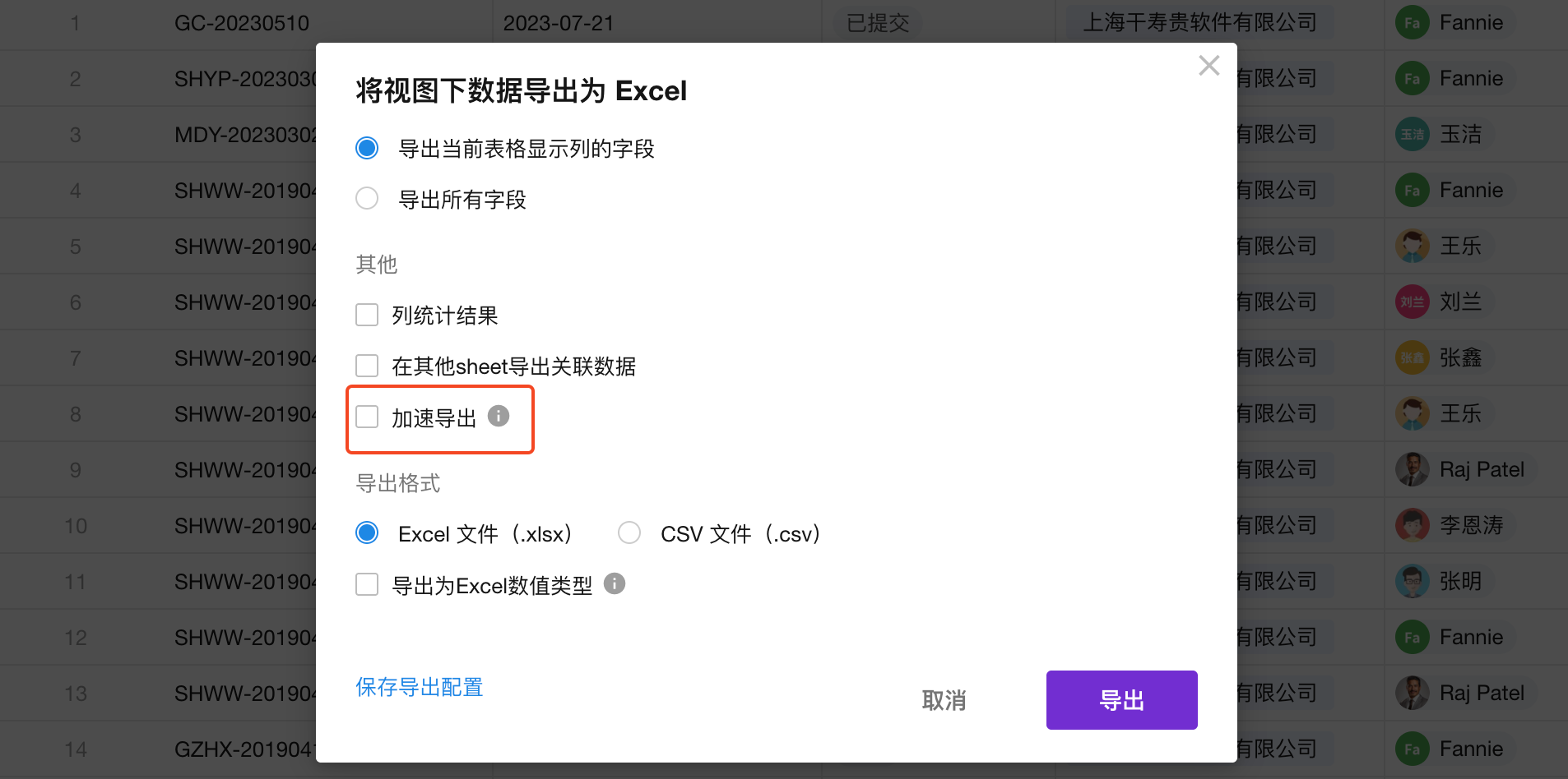 應用搭建資料操作資料的匯入和匯出匯出到Excel本頁導覽工作表数据如何导出到Excel文件 用户不能直接操作表数据,需要通过视图对表数据进行管理。因此,数据的导出是基于用户可见的视图下进行操作的。 1、导出全部可见记录